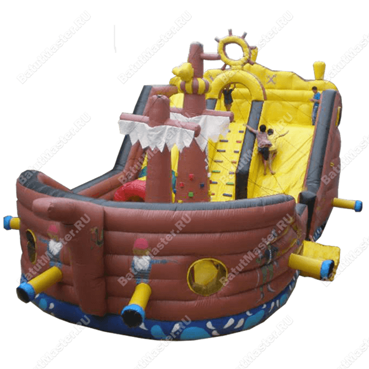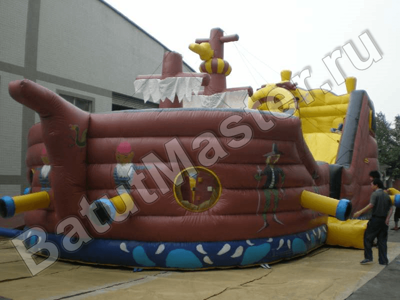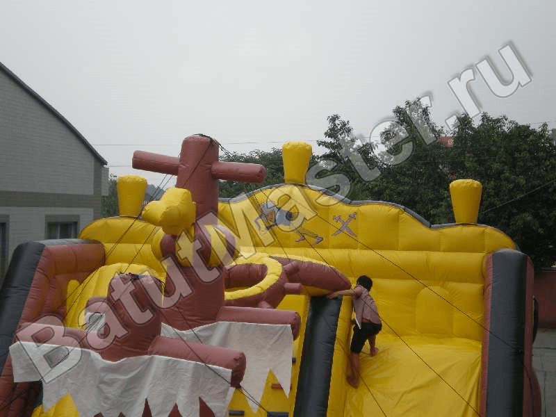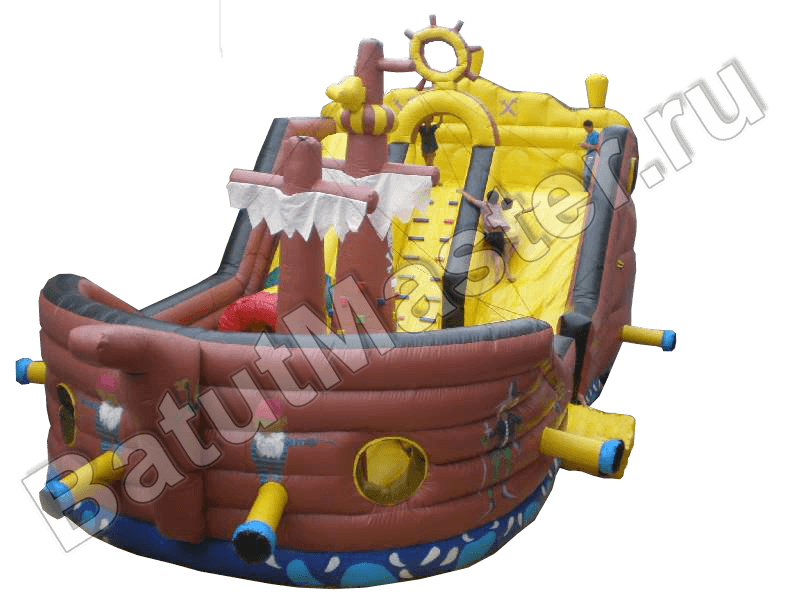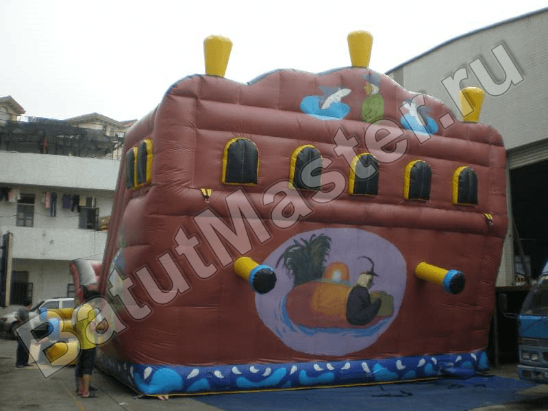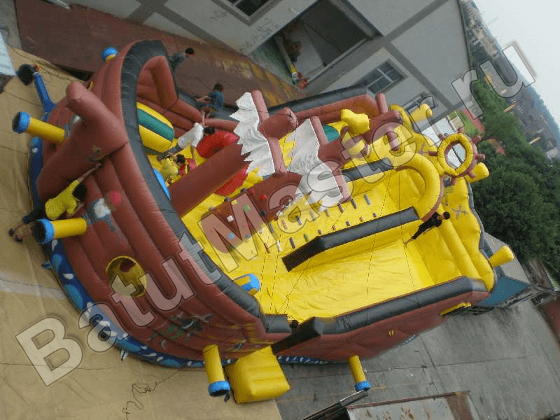 Боковые борта аттракциона достаточно высокие, чтобы оградить малышей от выпадения изнутри, вход внутрь расположен сбоку, ограждения есть также и по линии спусковой полосы на горке. Борта надувного корабля имеют специальные круглые окошки, они обтянуты сеткой для удобства контроля за ребятишками и в качестве дополнительной вентиляции.