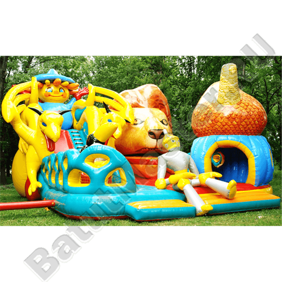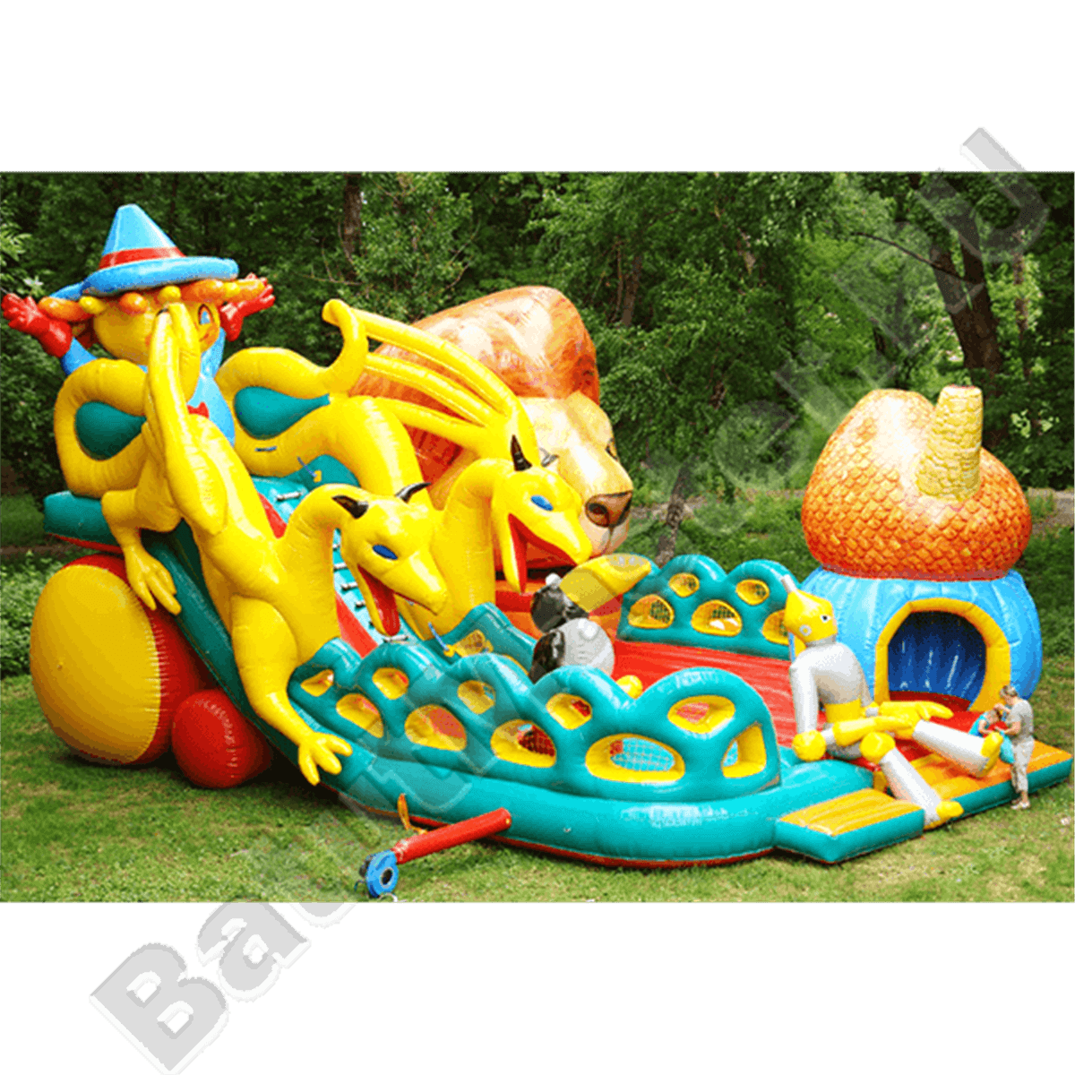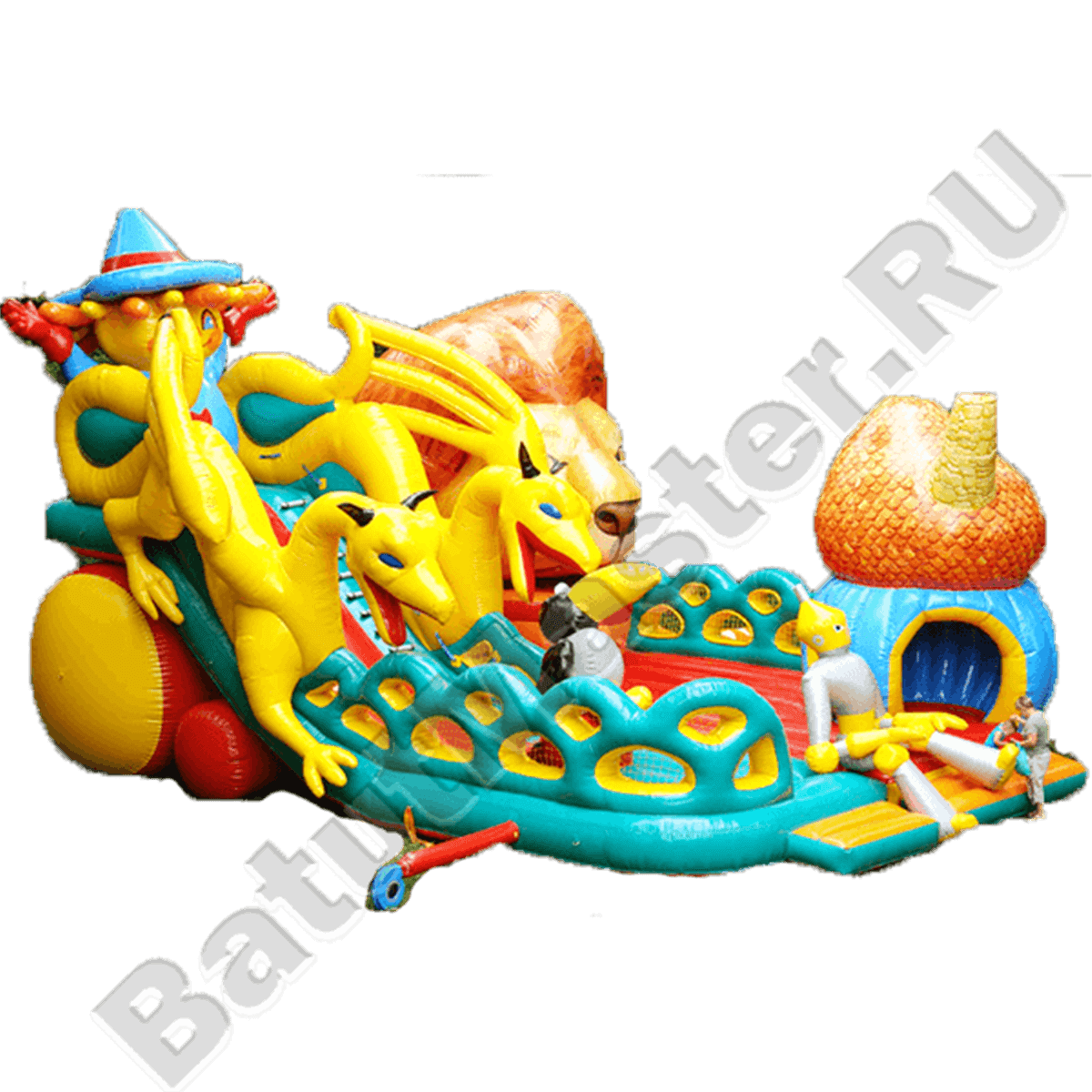 Следующая зона батута – горка, украшенная фигурами желтых драконов с обеих сторон. Эти надувные персонажи не просто украшают батут грациозностью своих тел, но и защищают детей от случайного выпадения с горки. Поднявшись по лестнице на самый верх стартовой площадки, дети встречаются со Страшилой Мудрым и после этого могут съехать вниз по горке. Правый задний угол площадки украшает огромная голова Смелого Льва.