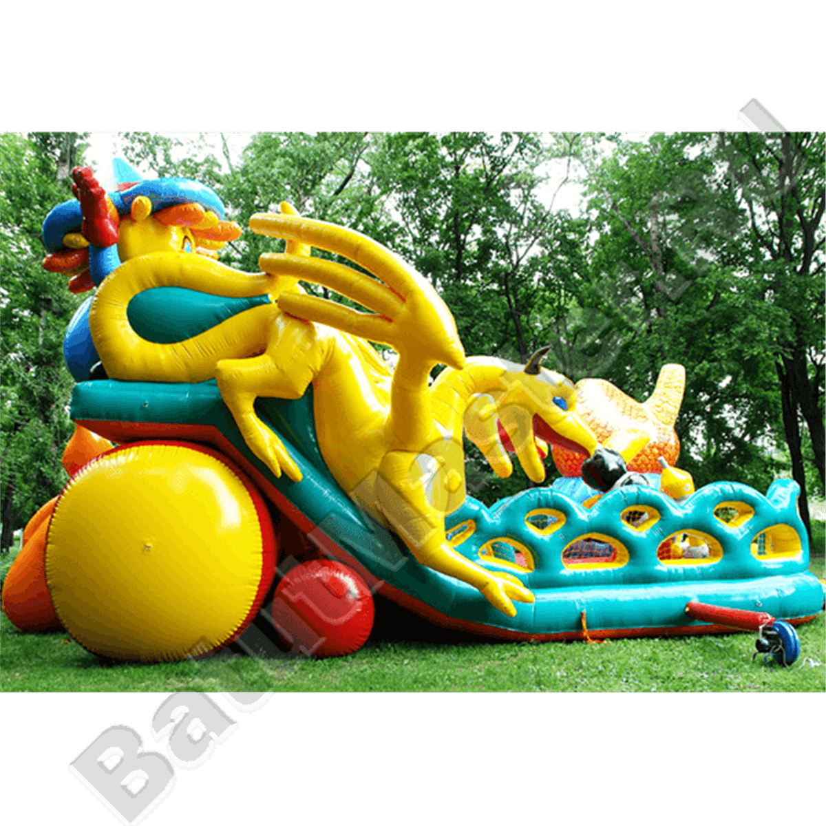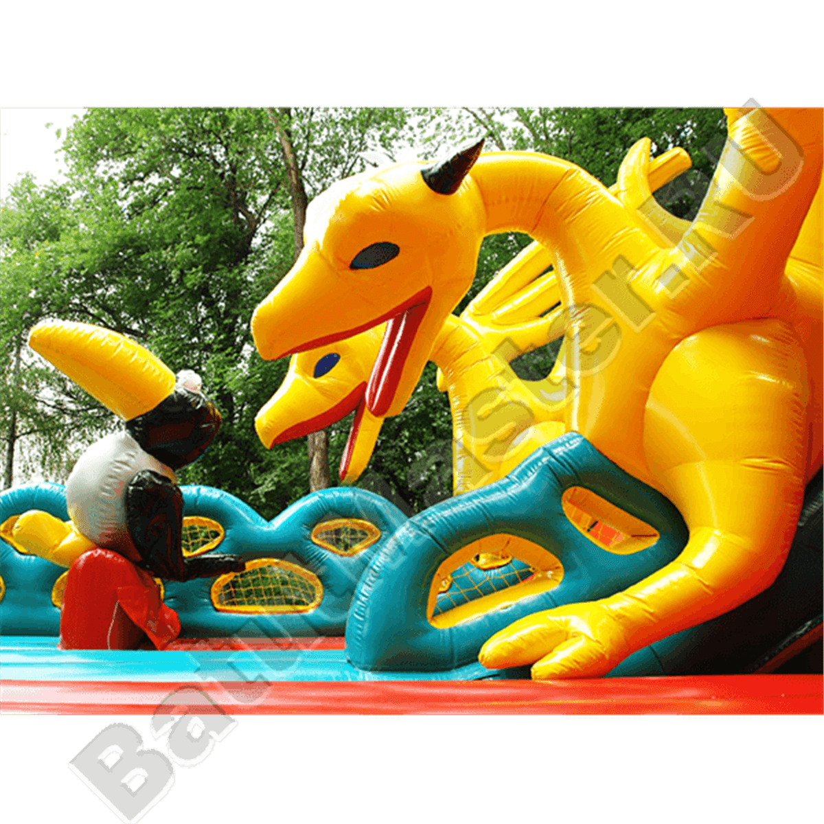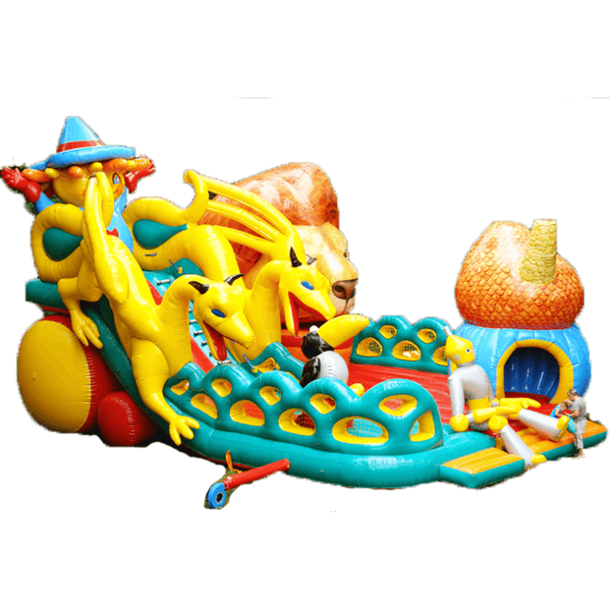 Следующая зона батута – горка, украшенная фигурами желтых драконов с обеих сторон. Эти надувные персонажи не просто украшают батут грациозностью своих тел, но и защищают детей от случайного выпадения с горки. Поднявшись по лестнице на самый верх стартовой площадки, дети встречаются со Страшилой Мудрым и после этого могут съехать вниз по горке. Правый задний угол площадки украшает огромная голова Смелого Льва.