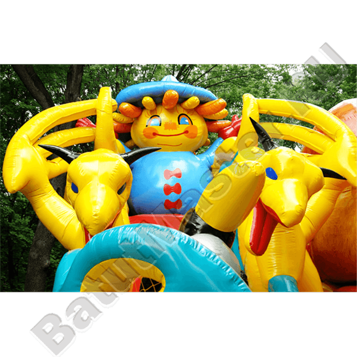 Надувной батут для бизнеса выполнен в необычной цветовой расцветке и дизайне. На площадке соединились бирюзовый и желтый цвета, поэтому общая картинка очень пестрая и выделяющаяся. Размеры коммерческого аттракциона 15,5 на 10 м дают возможность вместить внутри батута почти всех желающих, что очень выгодно для бизнеса. Большая часть элементов и персонажей в конструкции взята из известной детской сказки «Волшебник И с горкизумрудного города», поэтому уже на входе детей встречает узнаваемый Железный Дровосек.