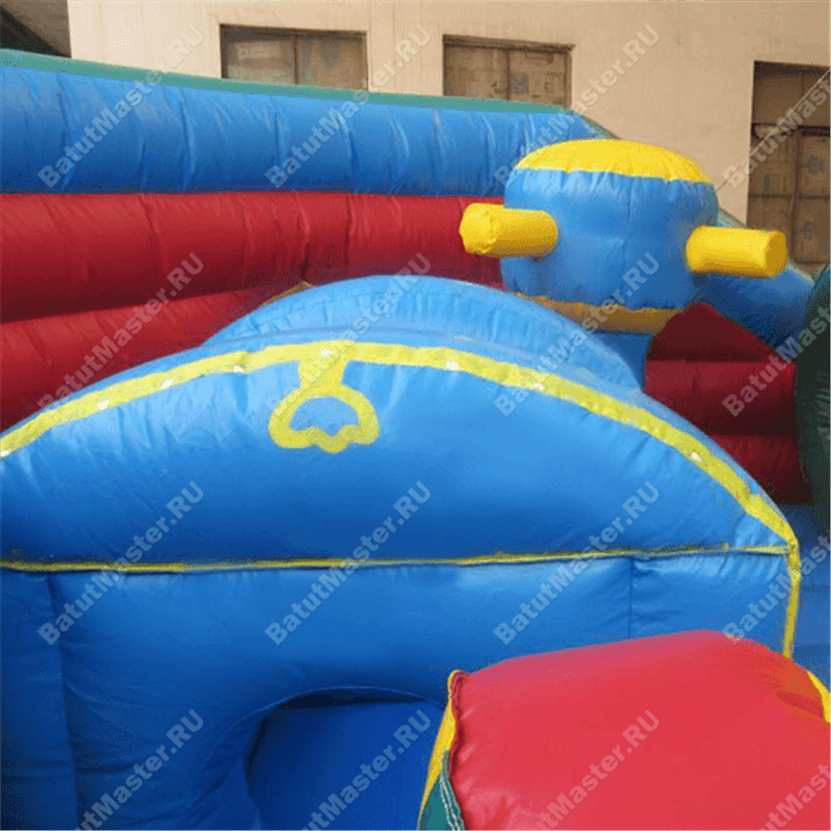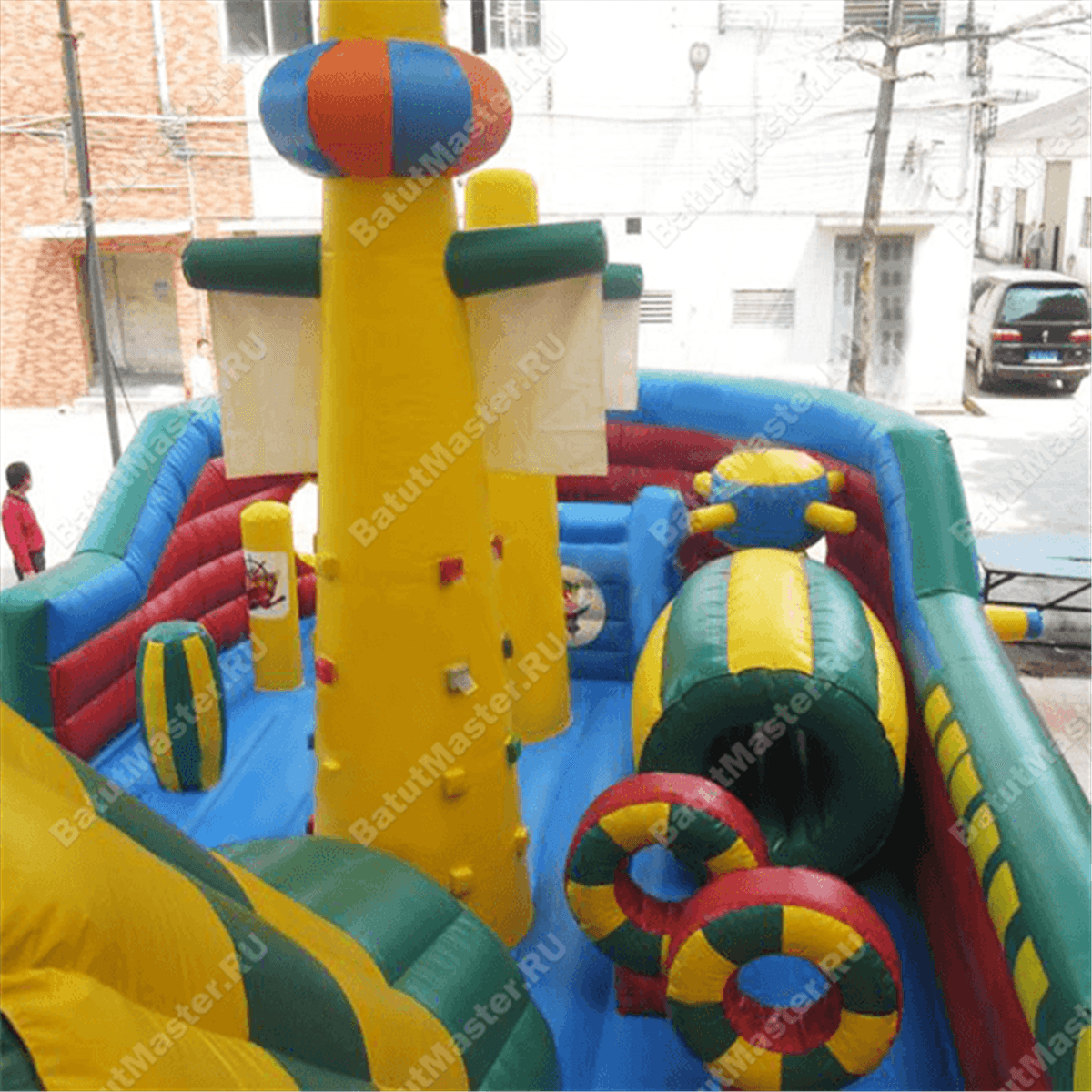 Учитывая размеры надувного батута 14 на 6 м, можно сделать вывод, что конструкция предназначена для бизнеса. К тому же, аттракцион разделен на 2 зоны: первая – горка, создающая второй этаж батута и состоящая из одной лестницы и двух спусков (один из них проходит внутри тоннеля); вторая – прыгательная часть с множеством игровых фигур в виде штурвала, бочек, лаза и тоннеля. В центре конструкции установлены 2 высокие мачты, на которых развеваются белые флаги. Более высокая мачта сделана в виде скалодрома.