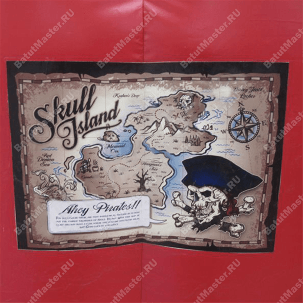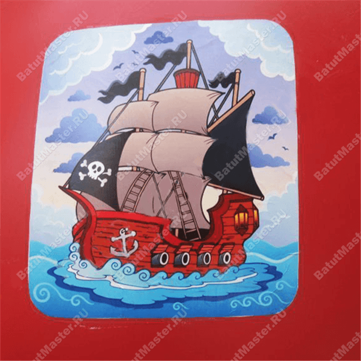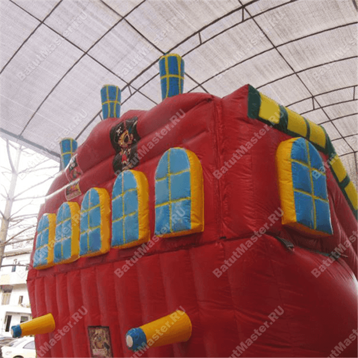 Яркий и многофункциональный надувной батут выполнен в стиле морского судна исторической эпохи. Внешние стенки коммерческого аттракциона оборудованы иллюминаторами и пушками, на них также можно встретить изображения пиратов и географических карт средневековья. Фасадные стены, придающие батуту форму настоящего корабля, изготовлены из красного ПВХ, сверху и снизу проходят голубые канты, плавно переходящие в прыгательную надувную подушку, застилающую всю внутреннюю поверхность комплекса.