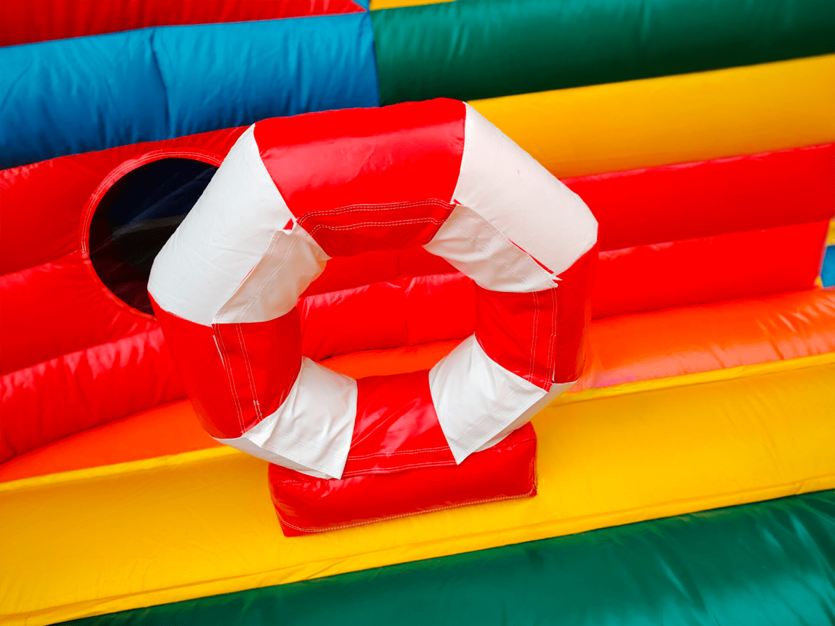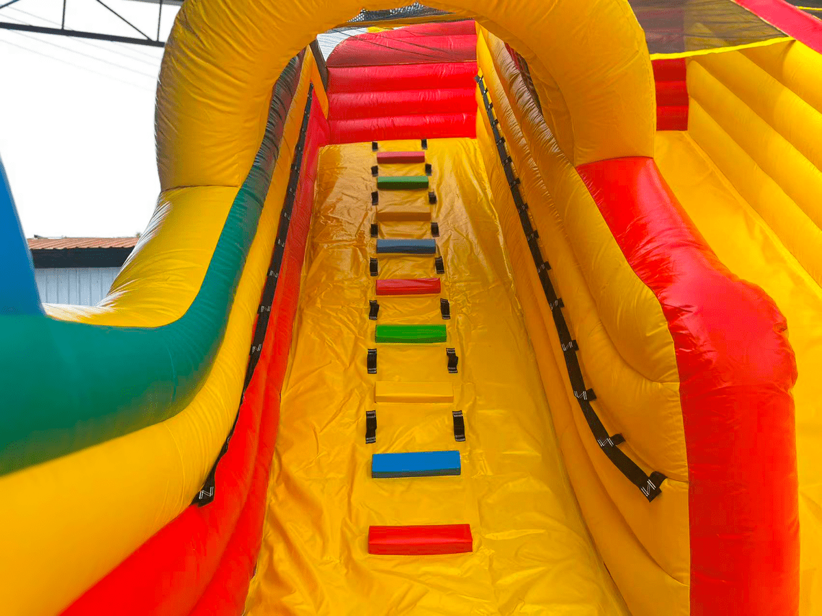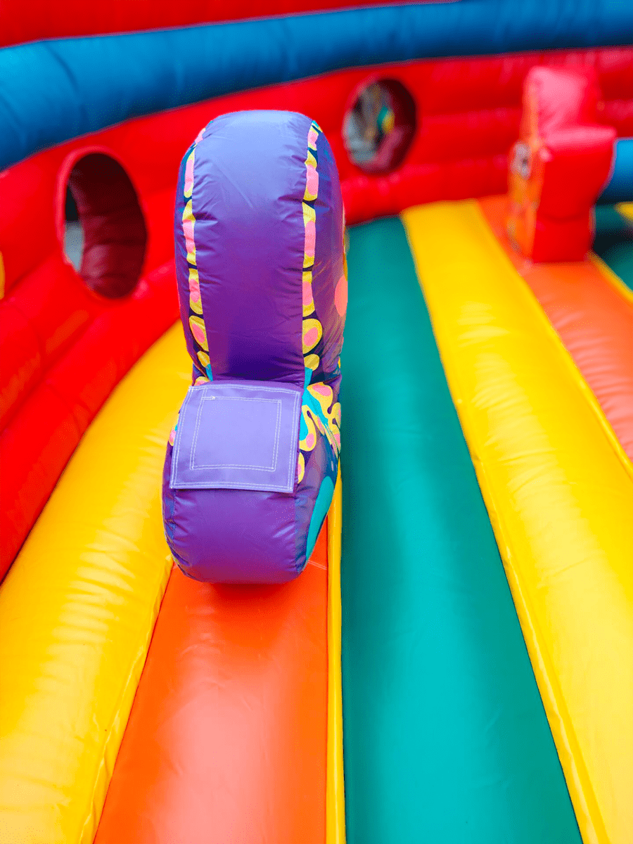 Основным развлечением данного батута можно назвать универсальную горку с двойным спуском – одна спусковая полоса изготовлена в виде скользкого полотна без препятствий, вторая накрыта сверху своеобразным чехлом-тоннелем и выходит к подножию скалодрома. Надувная скала в виде корабельной мачты усеяна мягкими ступенями уступами, что обеспечивает малышам простор для лазания на высоту.