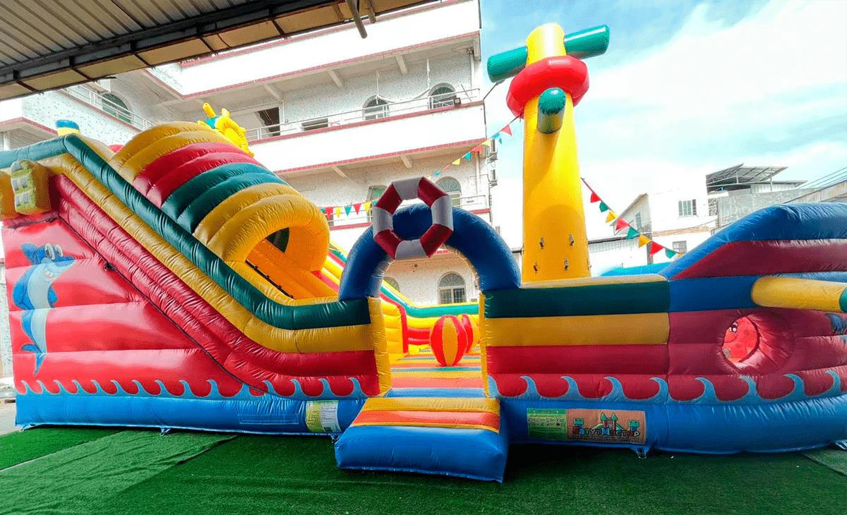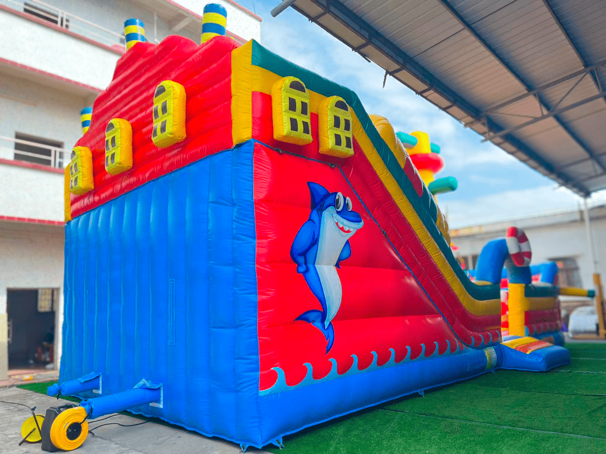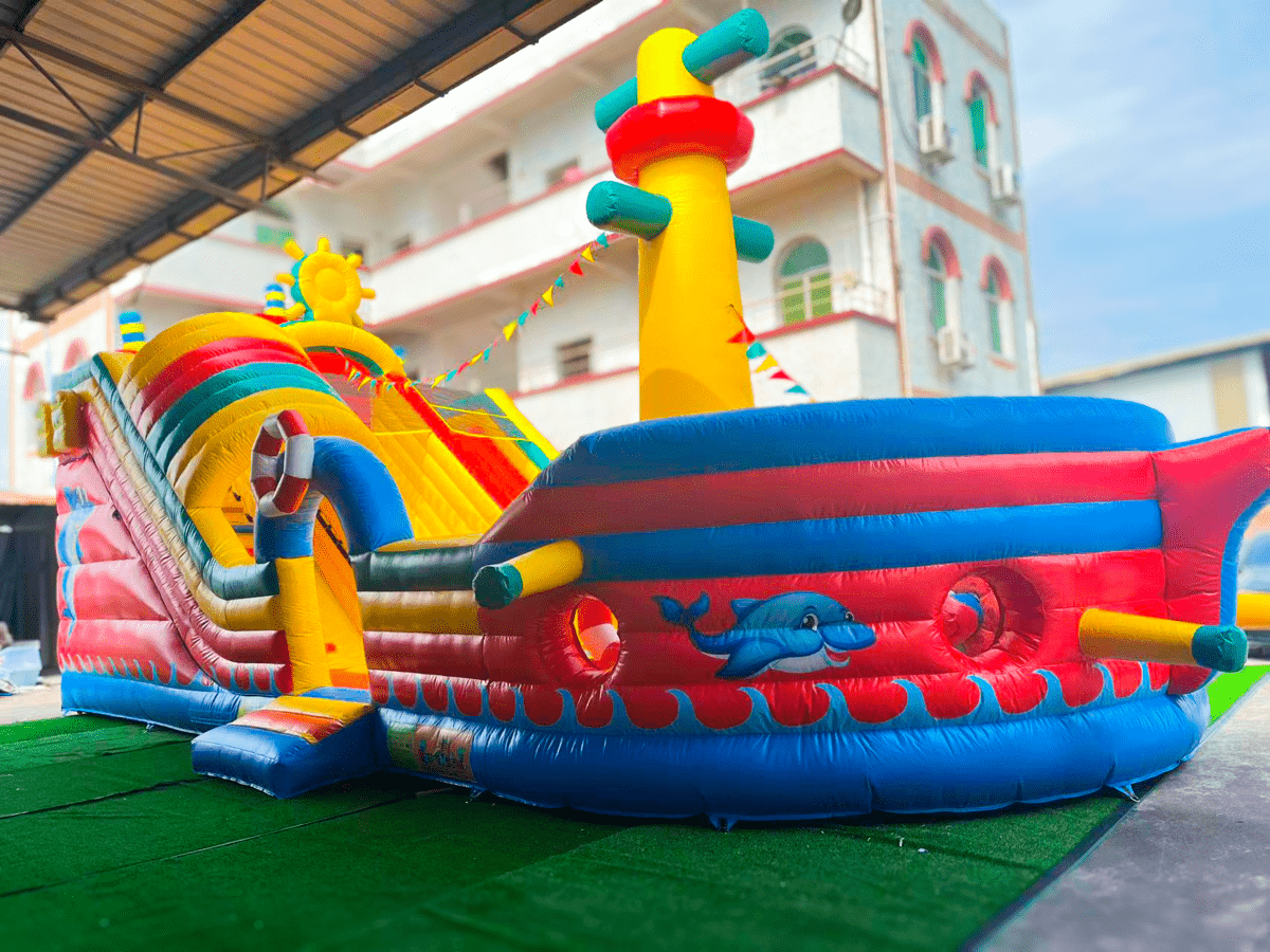 Пиратский корабль украшен яркими сквозными цилиндрами, столбами и арочными снарядами для ползания и прыжков, а также прочими игровыми фигурами, еще остается довольно просторная часть батута в качестве прыгательной зоны. Внутренняя часть и внешние борта батута-горки оформлены пиратскими изображениями и тематическими иллюстрациями. Такое универсальное надувное дополнение прекрасно подойдет для детской зоны во дворе или на игровой площадке, а компактная форма комплекса сэкономит массу места.