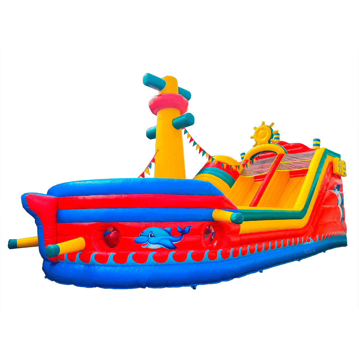 Эффектный батут-корабль «Корабль флибустьеров» выполнен в формате настоящего судна, бороздящего океан. Вход на внутреннюю зону располагается с боковой стороны, дополнен надувной ступенью для удобства входа-выхода.