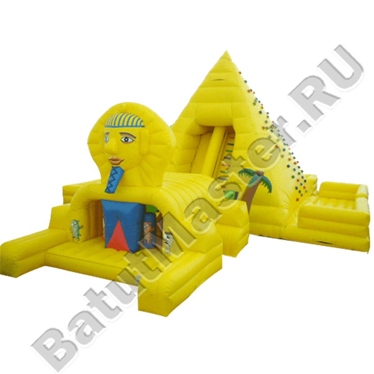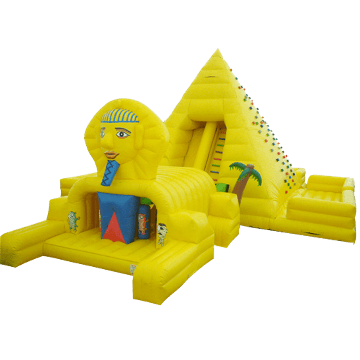 Детский надувной батут-горка "Луксор" выполнен в виде горки с крутым скатом, расположенной в центре Египетской Пирамиды. На внешнюю часть пирамиды по всей поверхности пришиты кубики, благодаря которым дети могут карабкаться на пирамиду по импровизированному скалодрому. Вокруг трёхстороннего скалодрома расположены игровые площадки, который служат матами на которые дети приземляются, если не справились с покорением пирамиды. Площадки защищены стенками, благодаря которым дети не выпадут за пределы батута. В передней части батута возвышается фигура Сфинкса, внутри которой туннель с игровыми фигурками. Многофункциональный батут "Луксор" - это очень полезный и весёлый детский аттракцион.