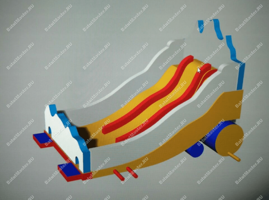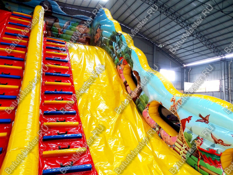 Зона горки разделена на 2 части, так как самих спусков 2: желтый и красный. У каждой горки есть своя отдельная лестница. Красная горка находится справа и от желтой отличается большей высотой. Желтая горка, расположенная в правой части, немного ниже красной. Горки не объединяются одной стартовой площадкой, их разделяет надувной желтый бордюр, поднимающийся вверх с самой нижней платформы. Но обе зоны спуска сверху оборудованы навесом из сетки, а задняя стена, выступающая над горкой, украшена изображениями русских богатырей. Конструкция сзади поддерживается двумя желто-красными надувными цилиндрами, а внешние края батута для бизнеса оборудованы высокими стенами с изображениями пейзажей и богатырей.