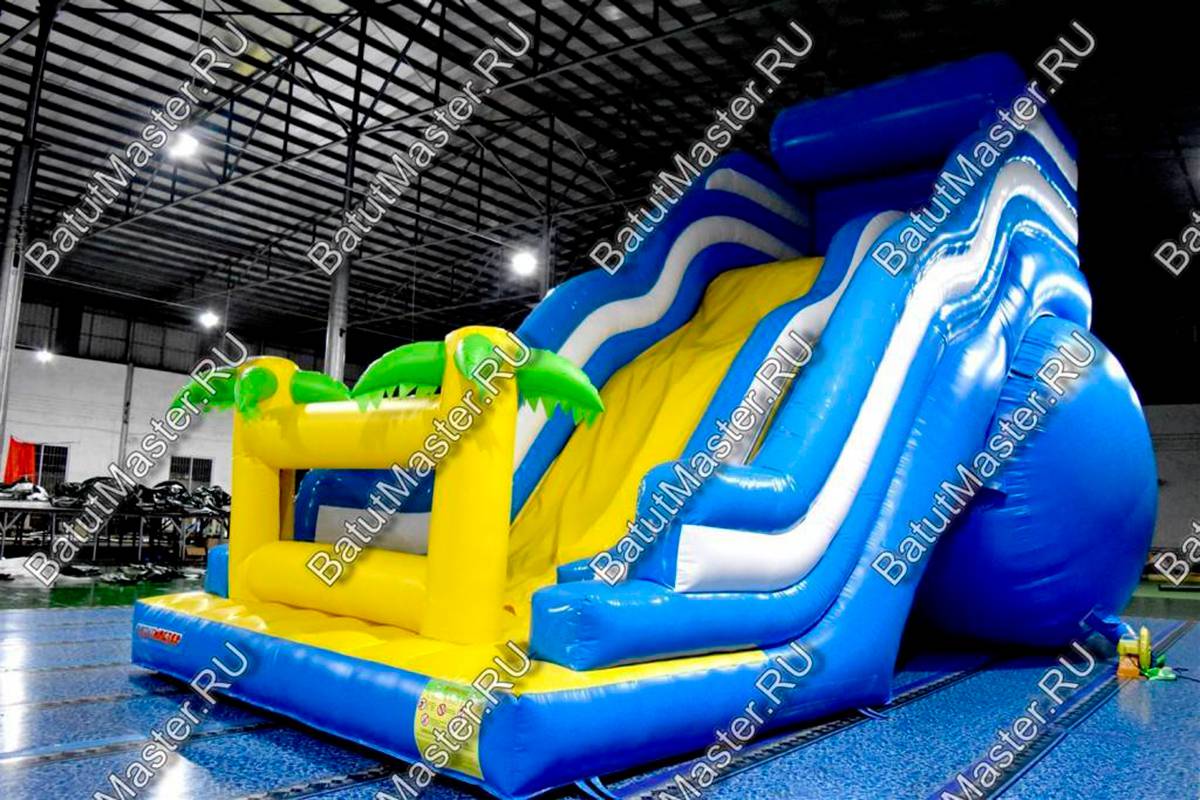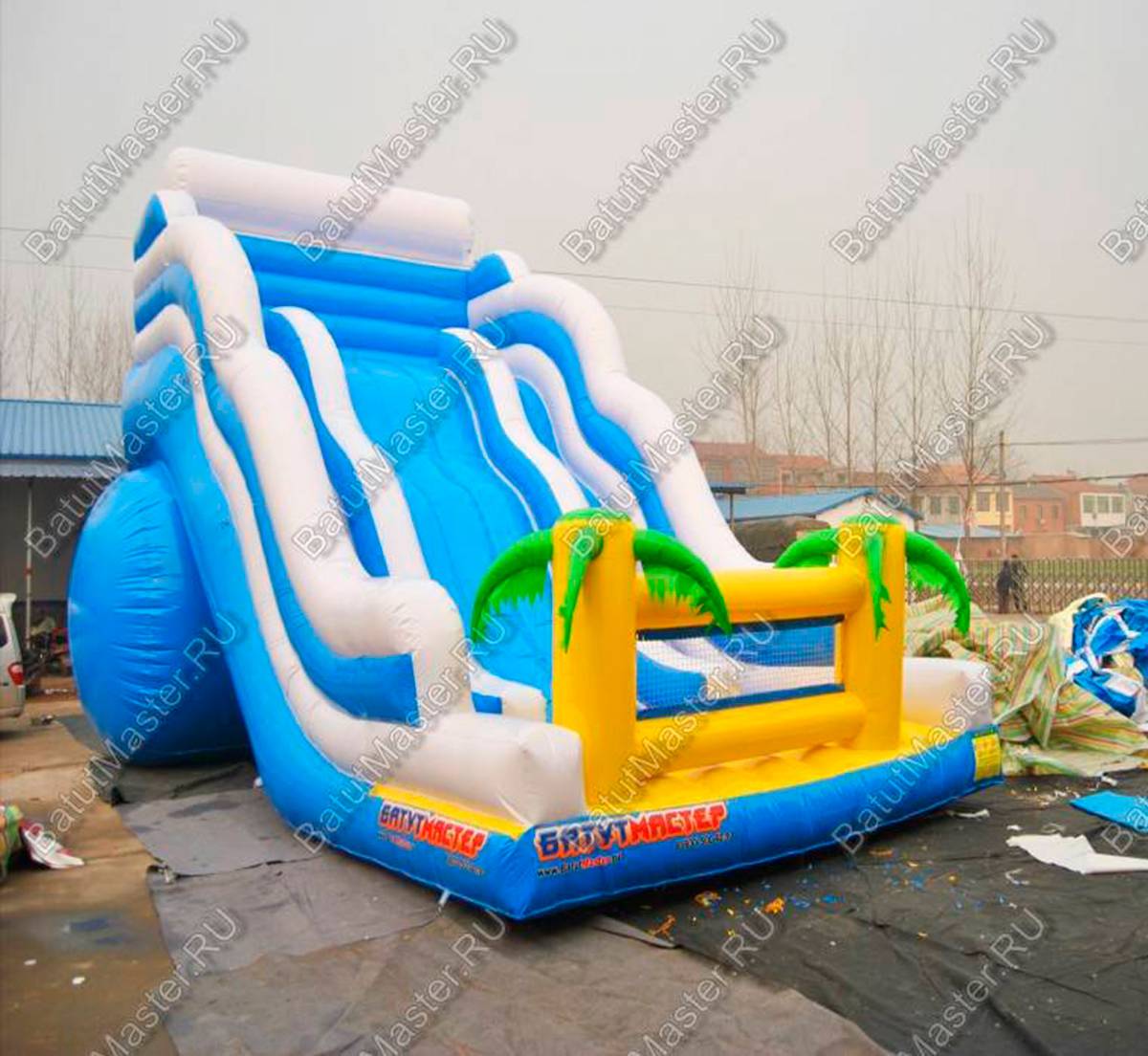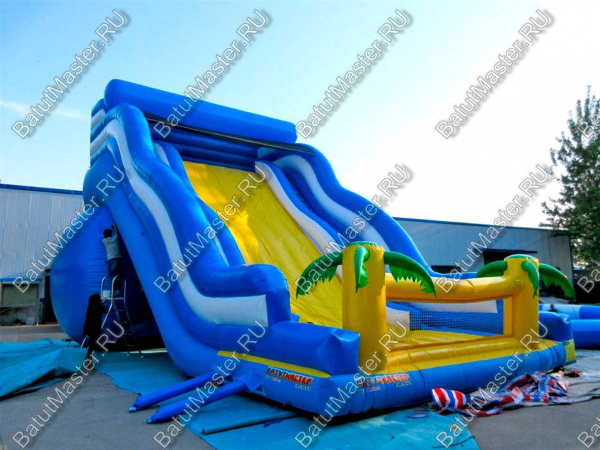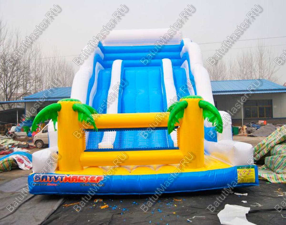Уличный батут в виде бело-голубой широкой горки, у подножия которой размещаются пальмыШирокая батут-горка – это половина того, что нужно каждому отдыхающему на летнем морском побережьеИногда для летнего отдыха достаточно одной эффектной батут-горки на пляже, чтобы проведенное свободное время запомнилось вам еще на целый предстоящий год. В цветовой гамме уличный батут выполнен из белого, синего и желтого ПВХ, при этом, последний цвет используется всего лишь один раз у подножия горки для создания защитной стены-отбойника. По обеим сторонам этой преграды установлены сочные пальмы, которые только украшают всю конструкцию.Синий и белый цвета распределились на самом спуске, и выполняют функцию окрашивания самой воды и морской пены, поэтому яркий батут кажется легким и воздушным. Высота его горки достаточно высока для того, чтобы аттракцион привлека всех посетителей пляжа без исключения. С двух сторон главной конструкции проходят узкие дорожки для подъема наверх. Как только отдыхающий справится с этим преодолением, его ждет заслуженный отдых на горизонтальной площадке перед непосредственным съездом вниз.