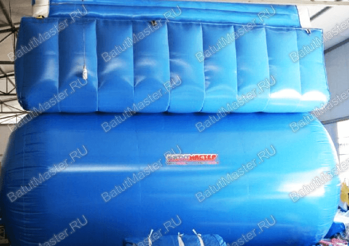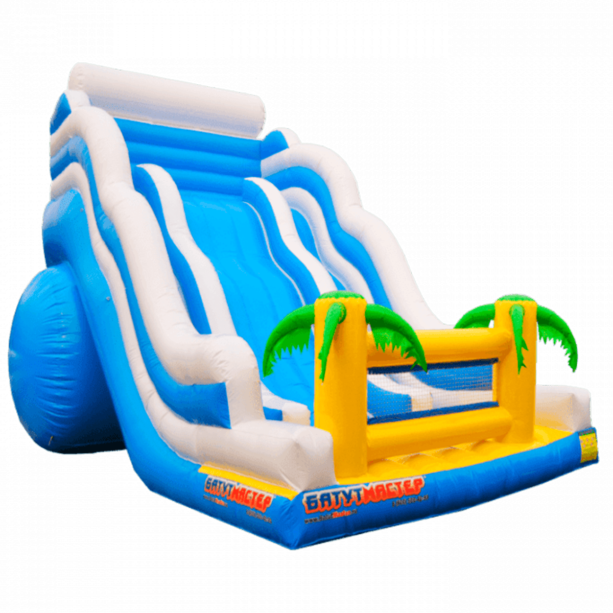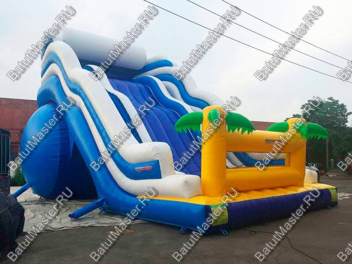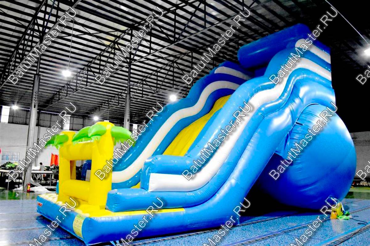 Уличный батут в виде бело-голубой широкой горки, у подножия которой размещаются пальмыШирокая батут-горка – это половина того, что нужно каждому отдыхающему на летнем морском побережьеИногда для летнего отдыха достаточно одной эффектной батут-горки на пляже, чтобы проведенное свободное время запомнилось вам еще на целый предстоящий год. В цветовой гамме уличный батут выполнен из белого, синего и желтого ПВХ, при этом, последний цвет используется всего лишь один раз у подножия горки для создания защитной стены-отбойника. По обеим сторонам этой преграды установлены сочные пальмы, которые только украшают всю конструкцию.Синий и белый цвета распределились на самом спуске, и выполняют функцию окрашивания самой воды и морской пены, поэтому яркий батут кажется легким и воздушным. Высота его горки достаточно высока для того, чтобы аттракцион привлека всех посетителей пляжа без исключения. С двух сторон главной конструкции проходят узкие дорожки для подъема наверх. Как только отдыхающий справится с этим преодолением, его ждет заслуженный отдых на горизонтальной площадке перед непосредственным съездом вниз.