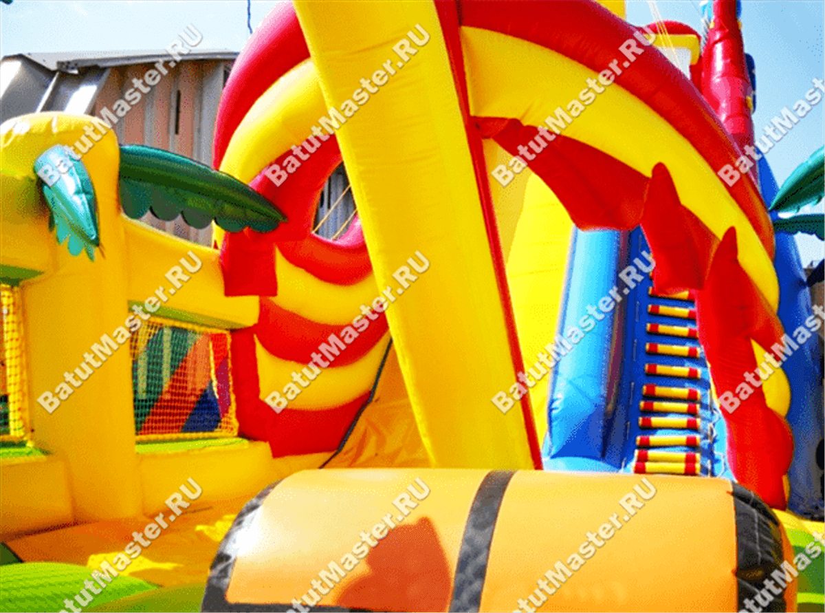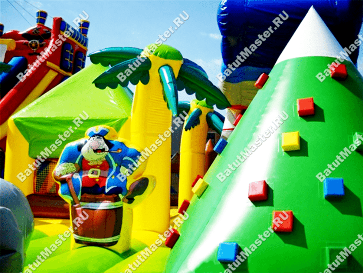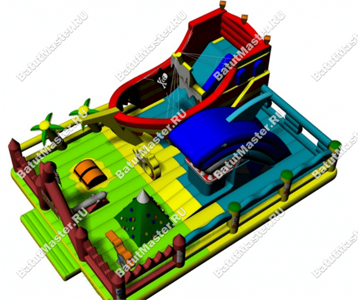 Оказавшись внутри аттракциона, ребенка не будет покидать ощущение, что он находится посреди открытого моря. Это чувство будут поддерживать яркие пальмы, старинные пушки для стрельбы из корабля и другие игровые фигуры в морской тематике. С правой стороны установлен конусовидный зеленый скалодром с красными фиксаторами для лазанья. Ограждение коричневого цвета по периметру всей площадки выглядит также, как декоративные фигуры в виде деревянных брусьев.