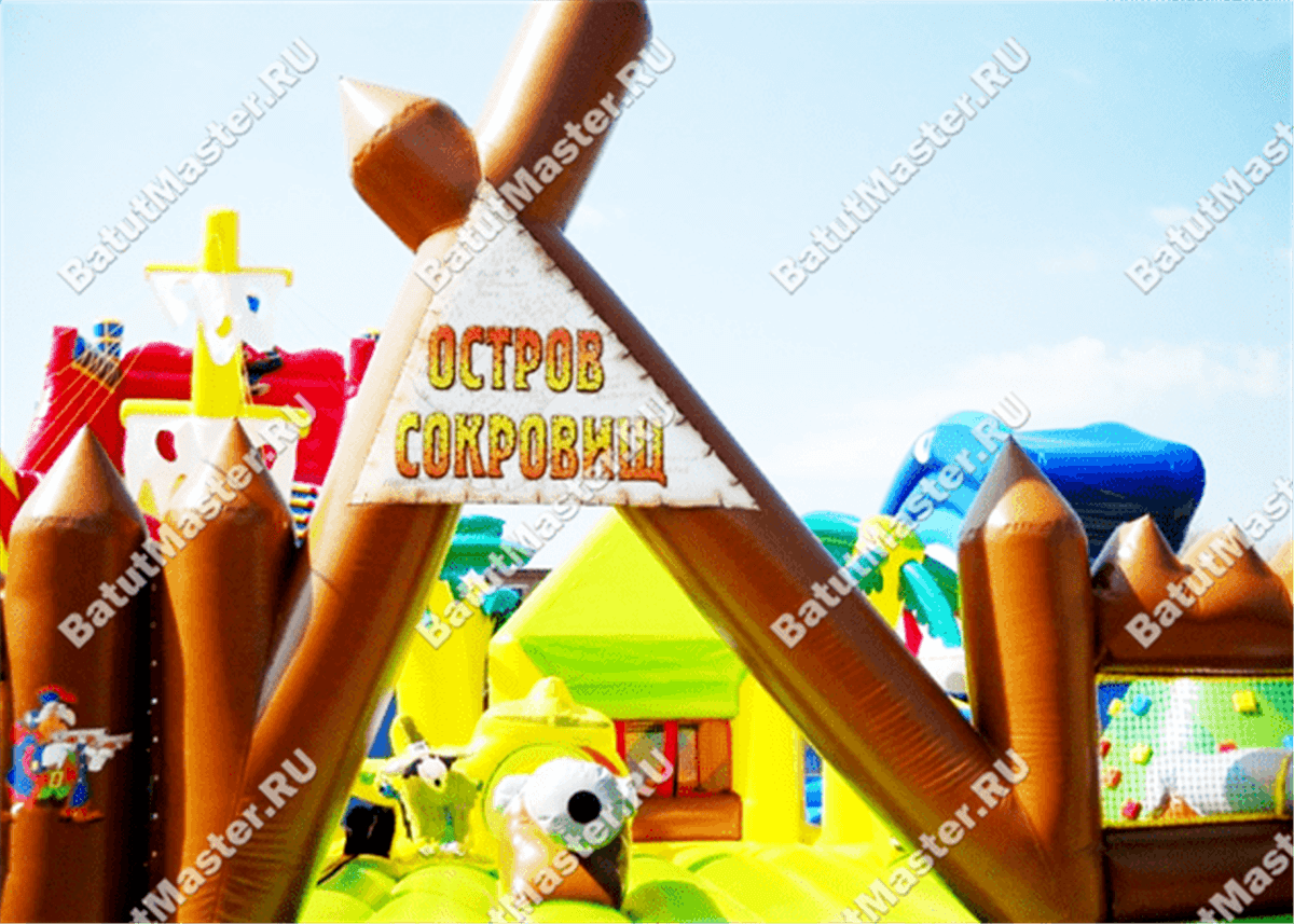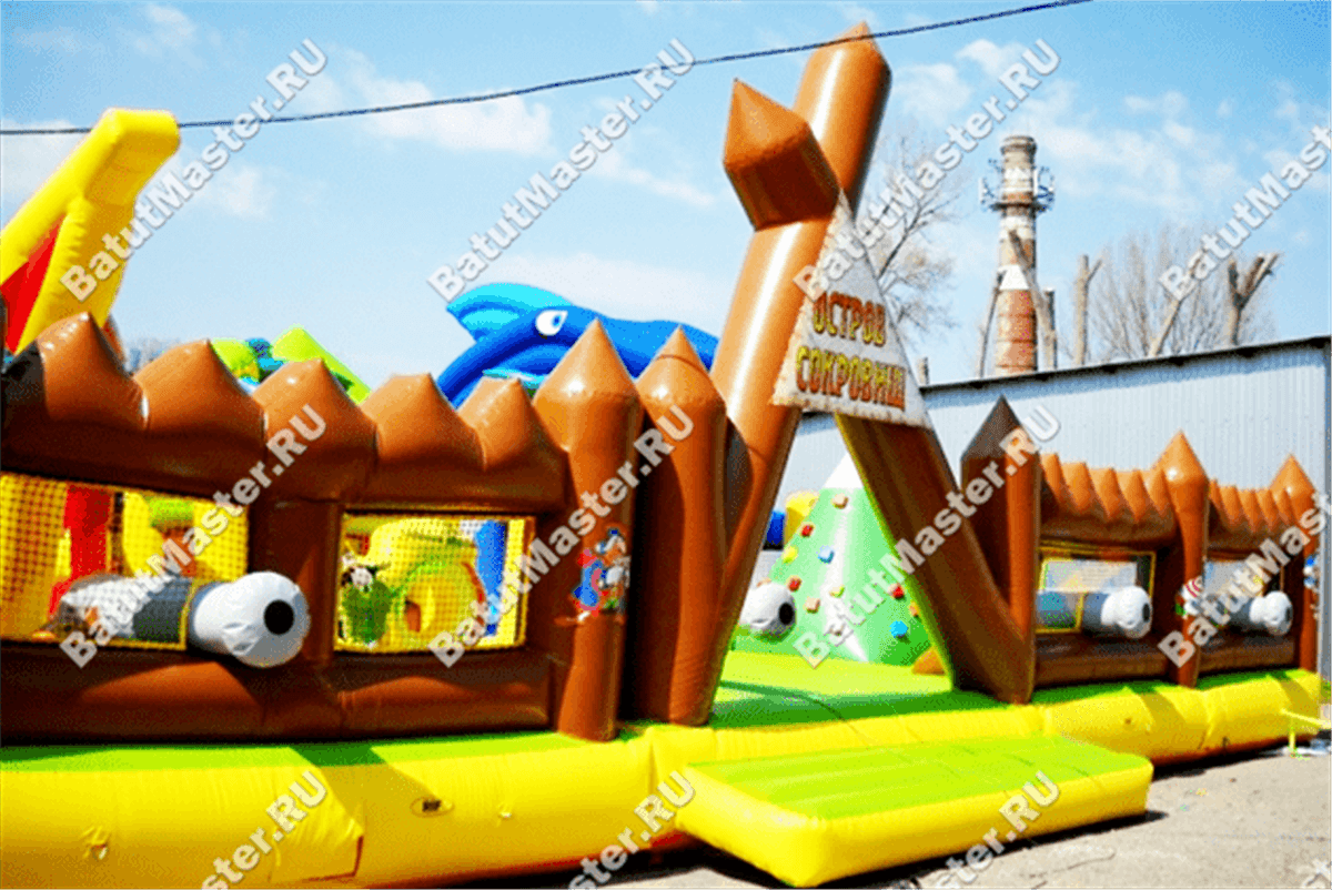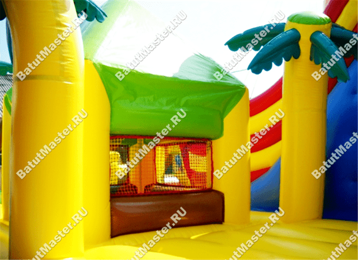 Оказавшись внутри аттракциона, ребенка не будет покидать ощущение, что он находится посреди открытого моря. Это чувство будут поддерживать яркие пальмы, старинные пушки для стрельбы из корабля и другие игровые фигуры в морской тематике. С правой стороны установлен конусовидный зеленый скалодром с красными фиксаторами для лазанья. Ограждение коричневого цвета по периметру всей площадки выглядит также, как декоративные фигуры в виде деревянных брусьев.