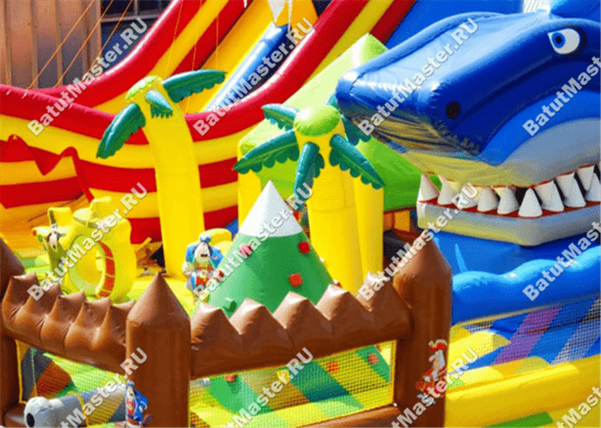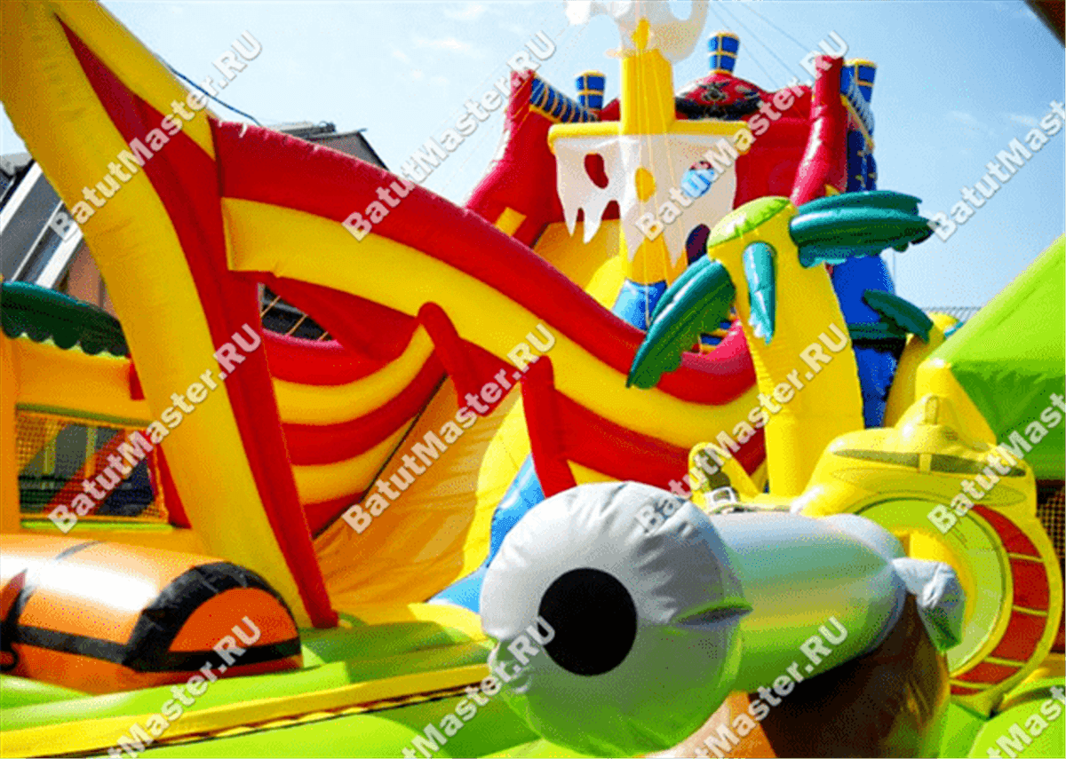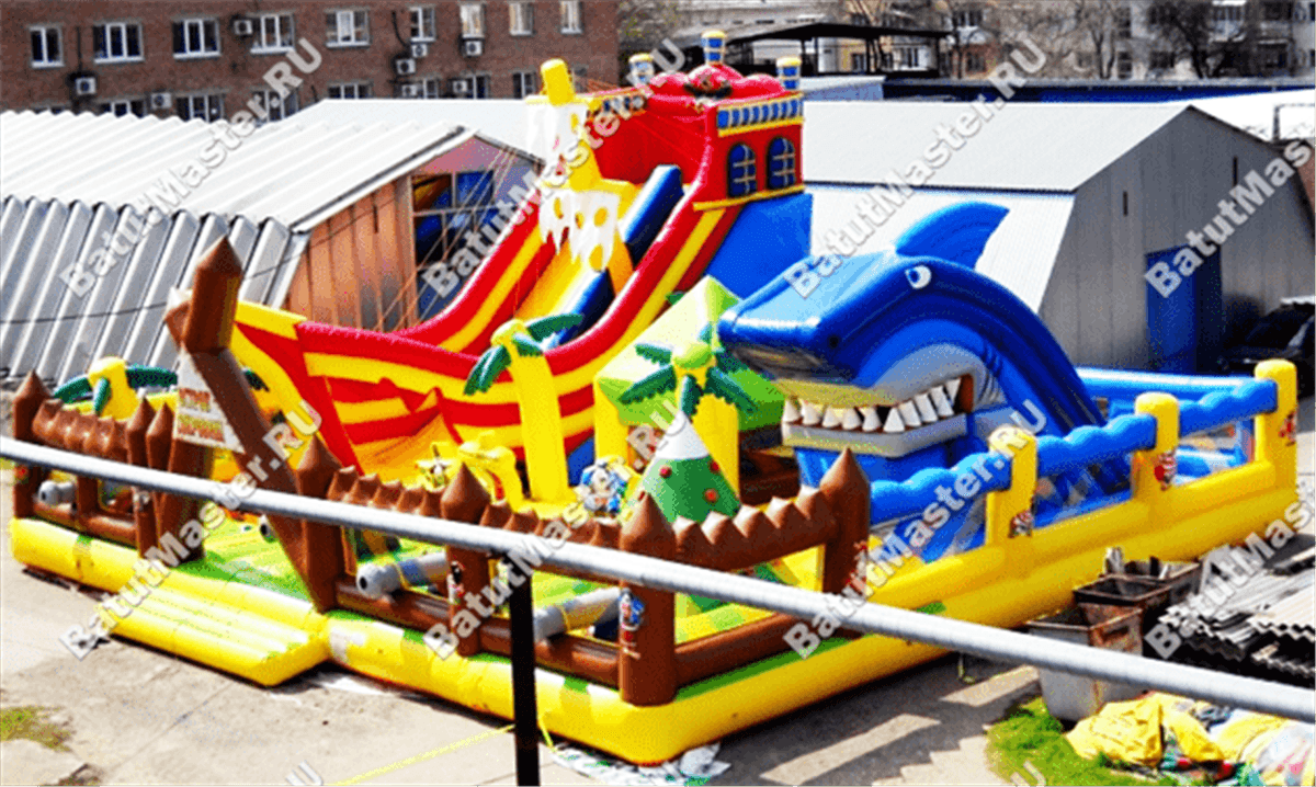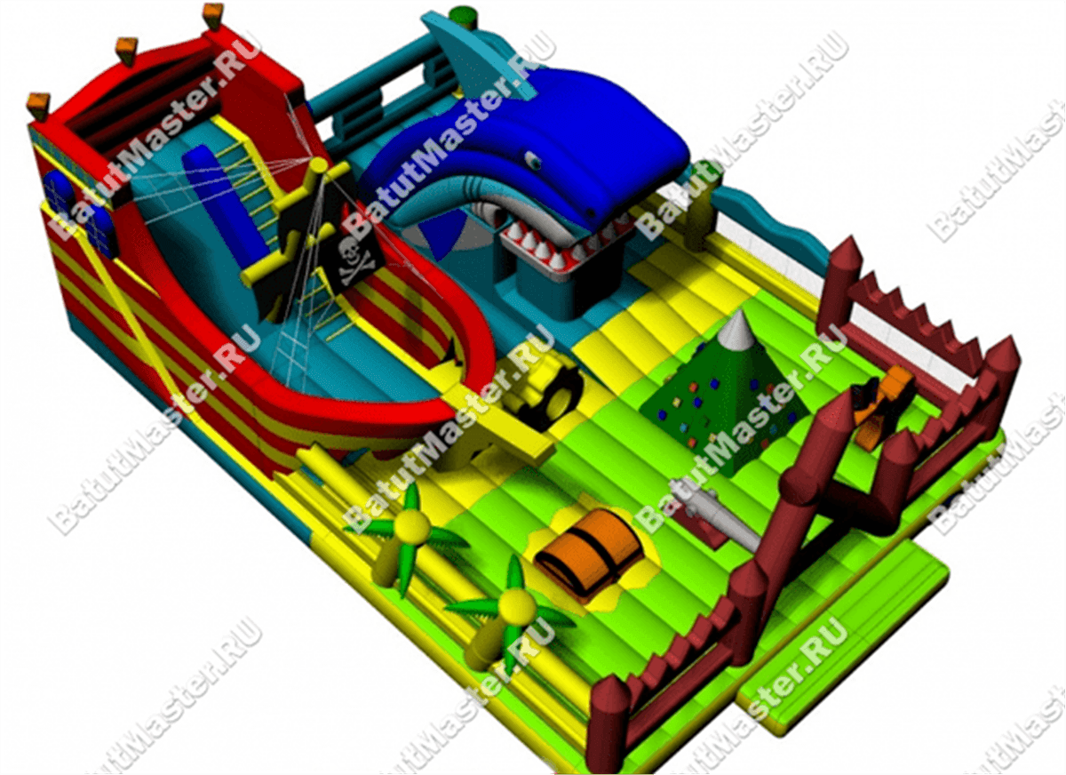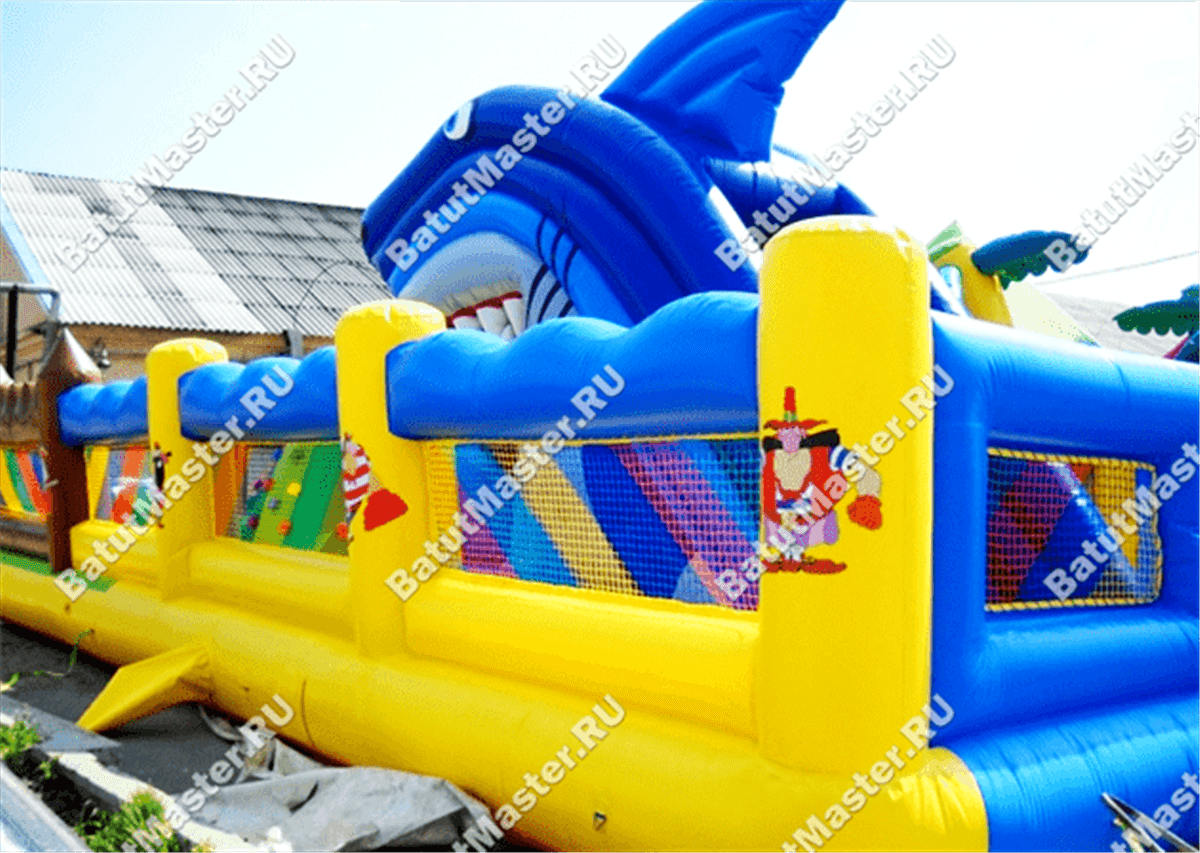 Огромная надувная площадка, которой и является открытый батут, это одновременно и достаточное место для прыжков и для бега с препятствиями. Их обязательно придется пройти, чтобы добраться до надувной акулы с робот-пастью, забавно открывающейся и закрывающейся. С левой стороны от большой рыбы расположен надувной корабль в желто-красной цветовой гамме в виде длинной и высокой горки, до нее тоже детям придется еще добраться. Самый верх морского судна украшен мягким капитанским мостиком, вдоль всей конструкции натянуты канаты, идущие от длинной мачты желтого цвета.