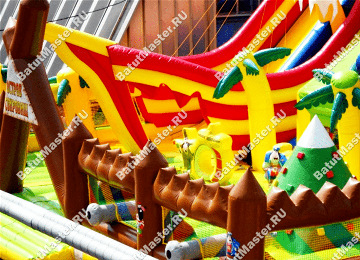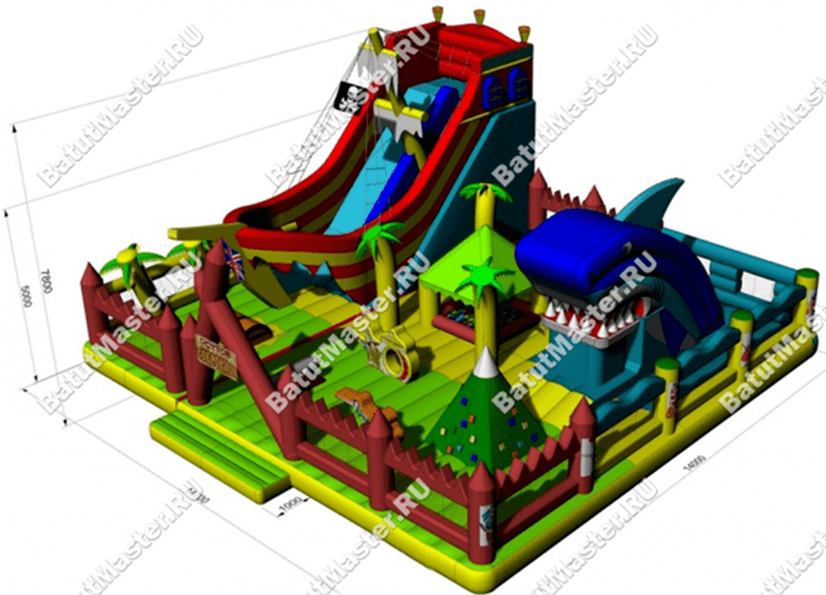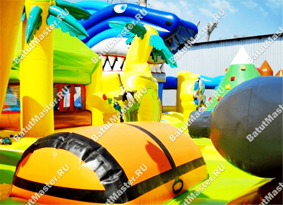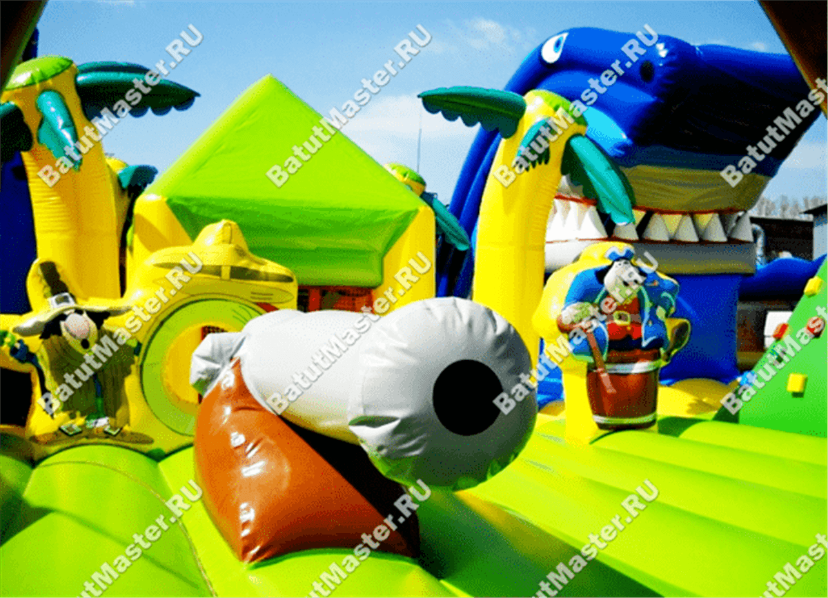 Огромная надувная площадка, которой и является открытый батут, это одновременно и достаточное место для прыжков и для бега с препятствиями. Их обязательно придется пройти, чтобы добраться до надувной акулы с робот-пастью, забавно открывающейся и закрывающейся. С левой стороны от большой рыбы расположен надувной корабль в желто-красной цветовой гамме в виде длинной и высокой горки, до нее тоже детям придется еще добраться. Самый верх морского судна украшен мягким капитанским мостиком, вдоль всей конструкции натянуты канаты, идущие от длинной мачты желтого цвета.