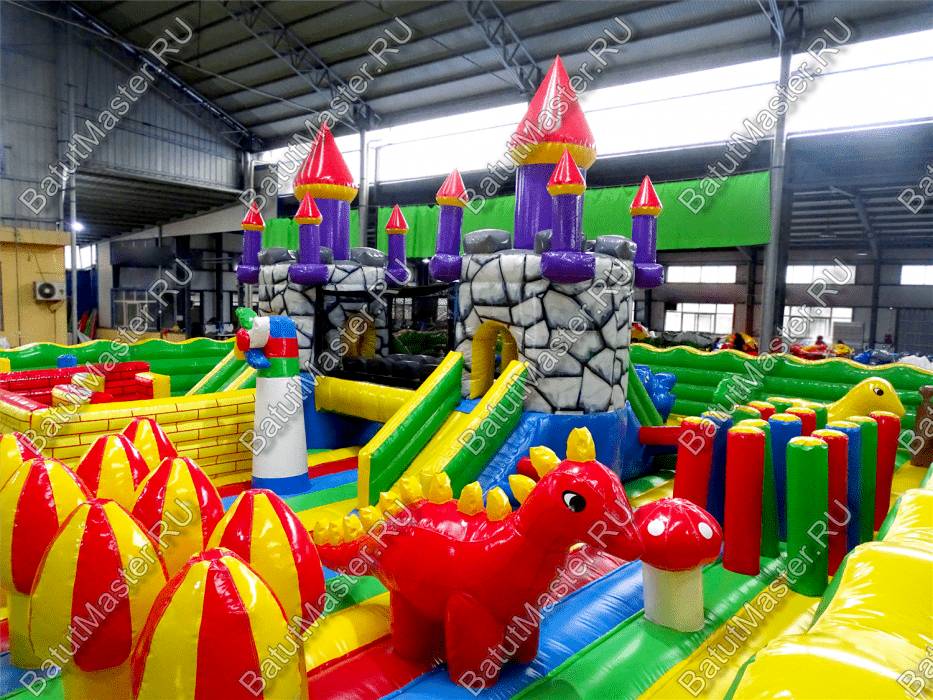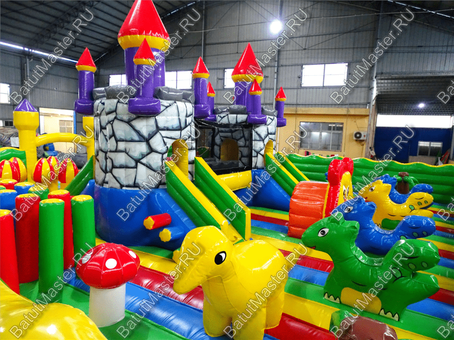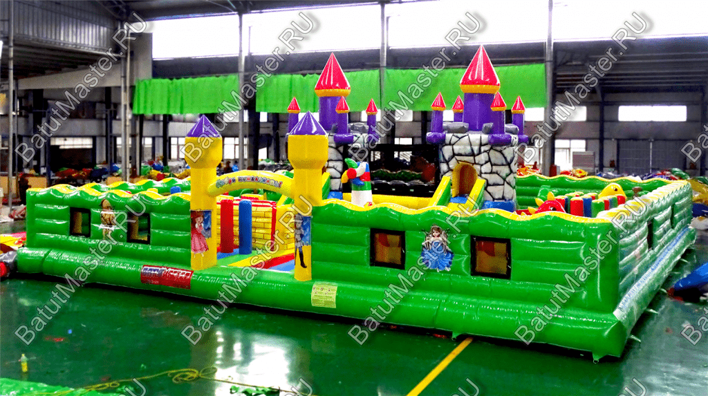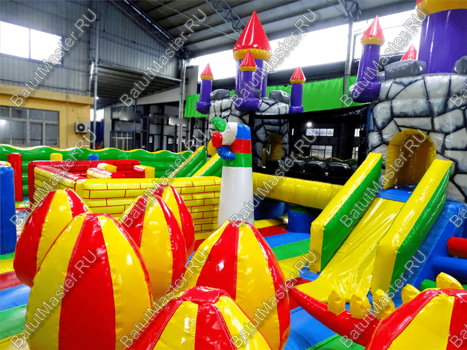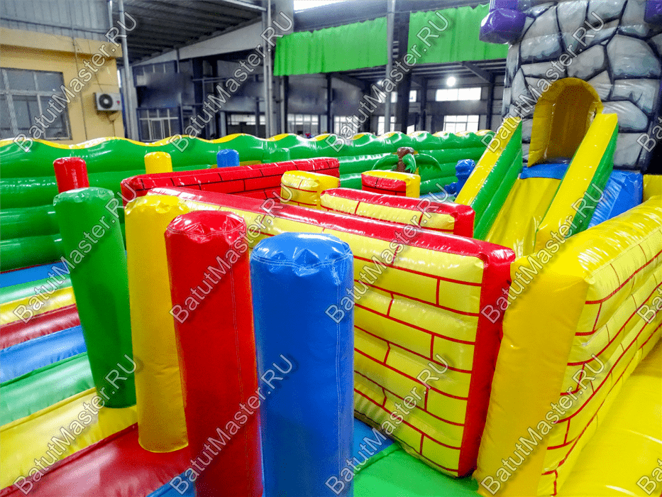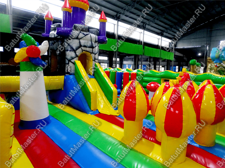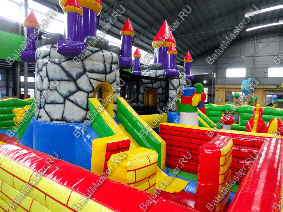 Центральную часть батута для бизнеса занимает надувная крепость, которая состоит из двух башен с прозрачным переходом-мостиком из сетки. Взобраться на эти конструкции можно по лестницам, расположенным на задней части площадки. Помимо того, что дети могут перемещаться с одной башни в другую, из них можно съезжать вниз по невысоким горкам. После съезда с левой башни ребенок оказывается в лабиринте из надувных стен, которые по своей окраске имитируют настоящую каменную кладку. Между башнями установлена милая надувная мельница, а все остальное пространство занято игровыми фигурами в виде животных, лазов, тоннелей, башен и столбиков.