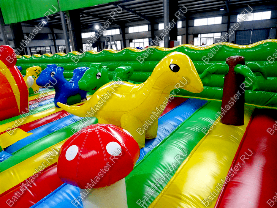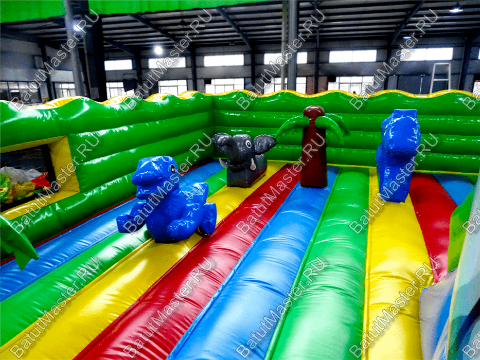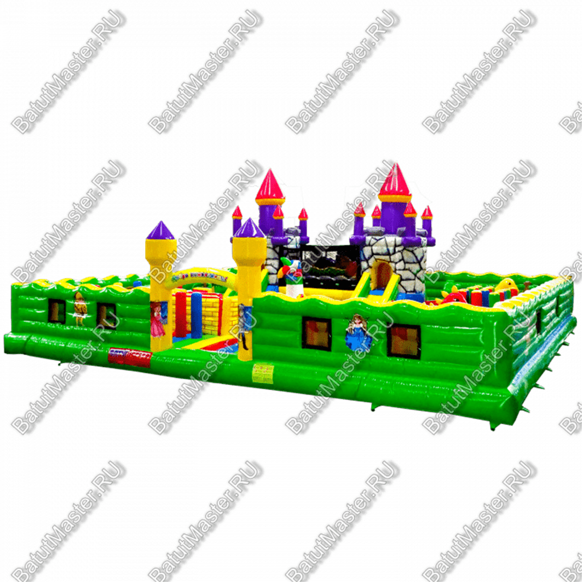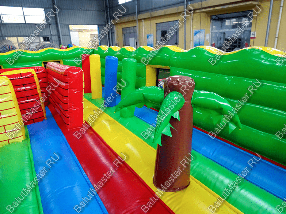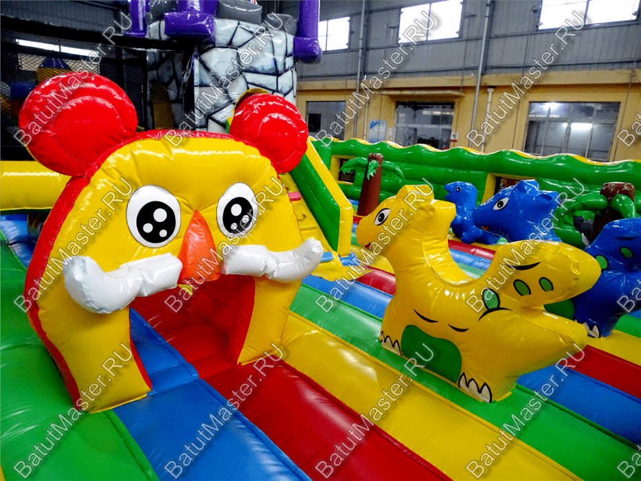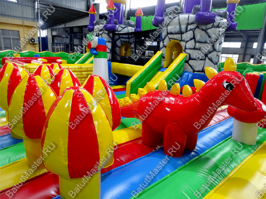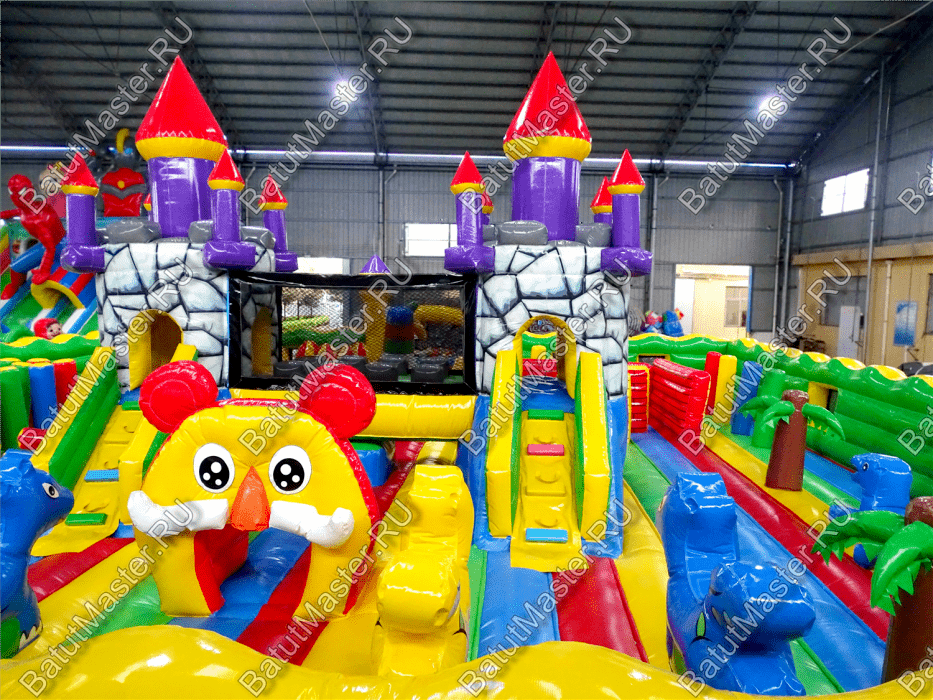 Центральную часть батута для бизнеса занимает надувная крепость, которая состоит из двух башен с прозрачным переходом-мостиком из сетки. Взобраться на эти конструкции можно по лестницам, расположенным на задней части площадки. Помимо того, что дети могут перемещаться с одной башни в другую, из них можно съезжать вниз по невысоким горкам. После съезда с левой башни ребенок оказывается в лабиринте из надувных стен, которые по своей окраске имитируют настоящую каменную кладку. Между башнями установлена милая надувная мельница, а все остальное пространство занято игровыми фигурами в виде животных, лазов, тоннелей, башен и столбиков.