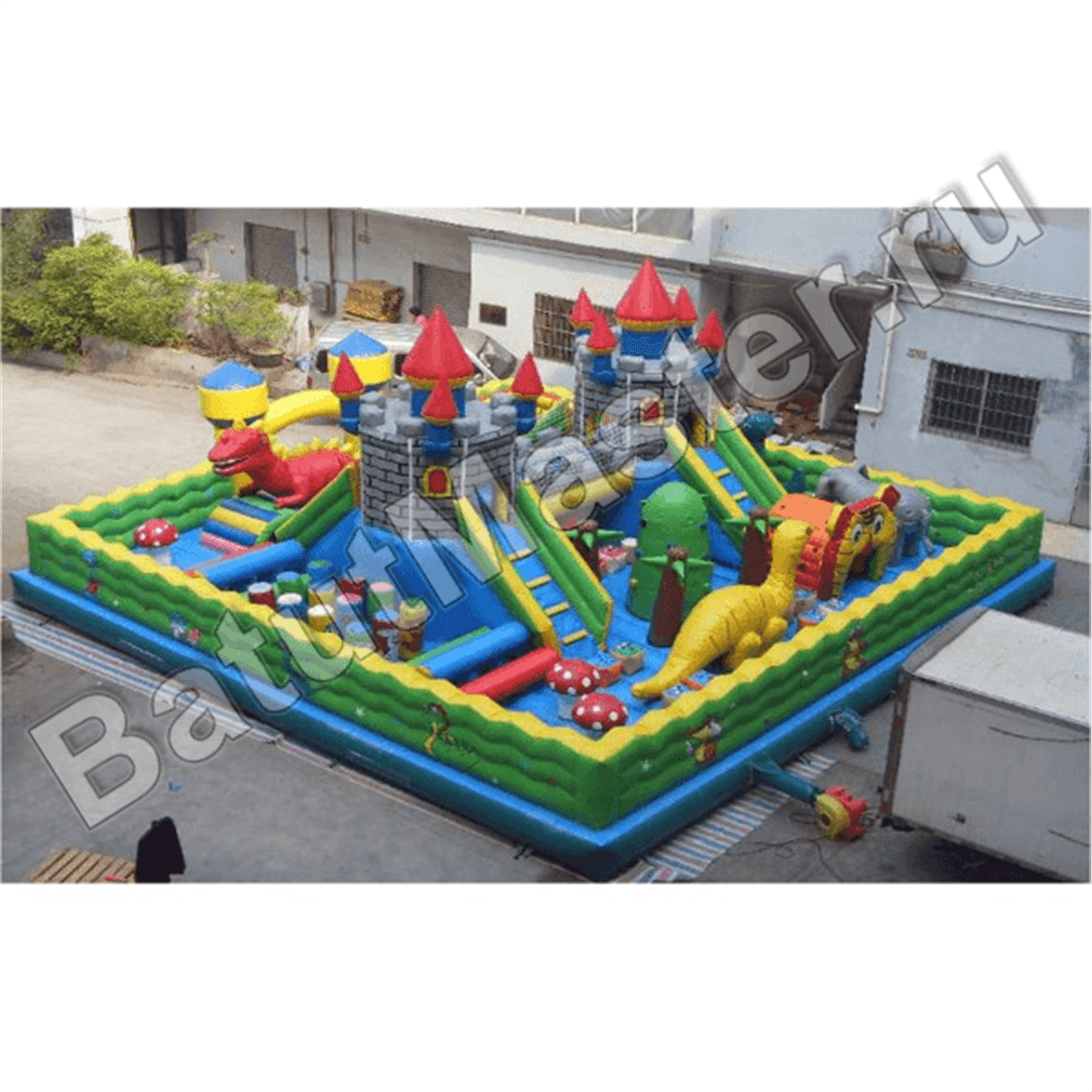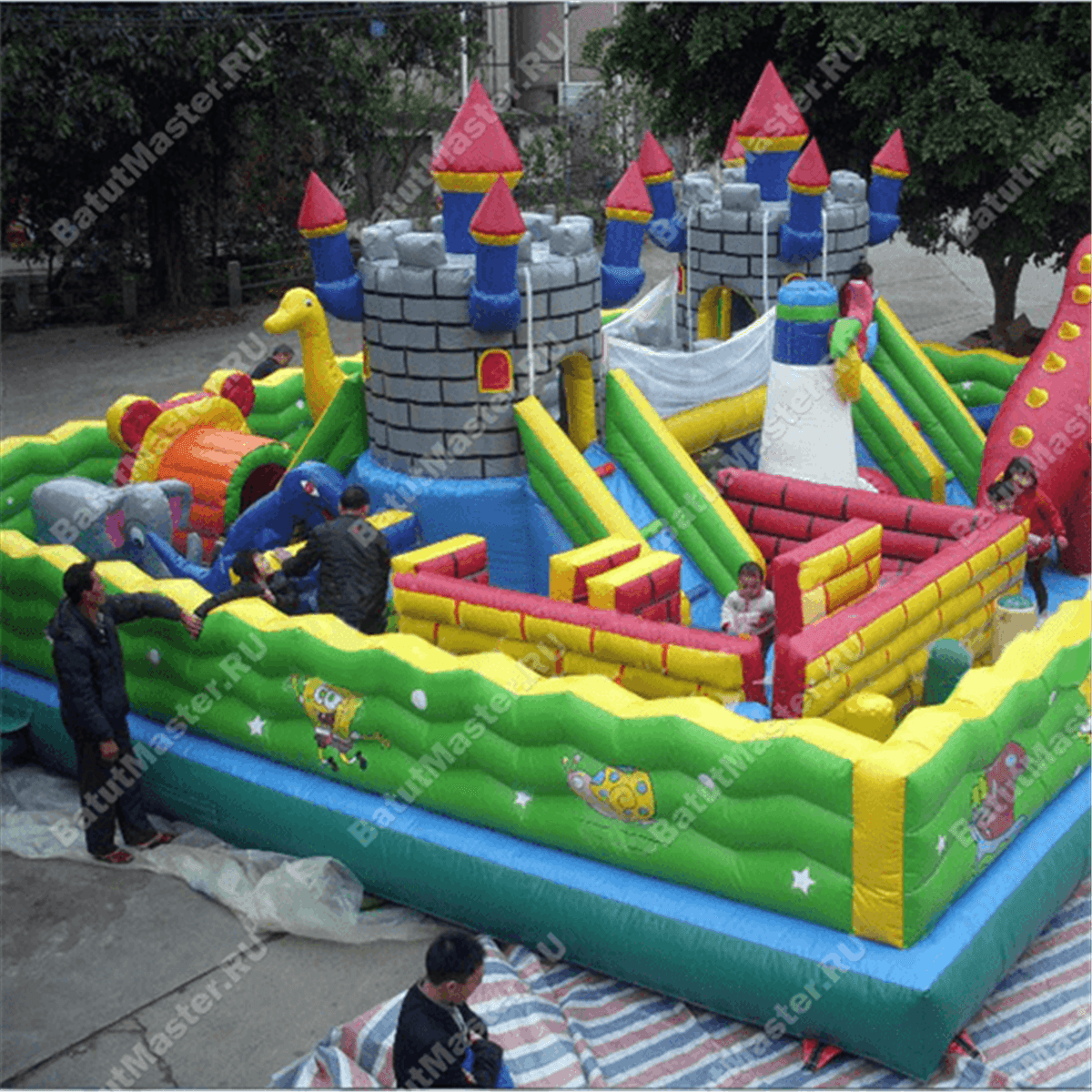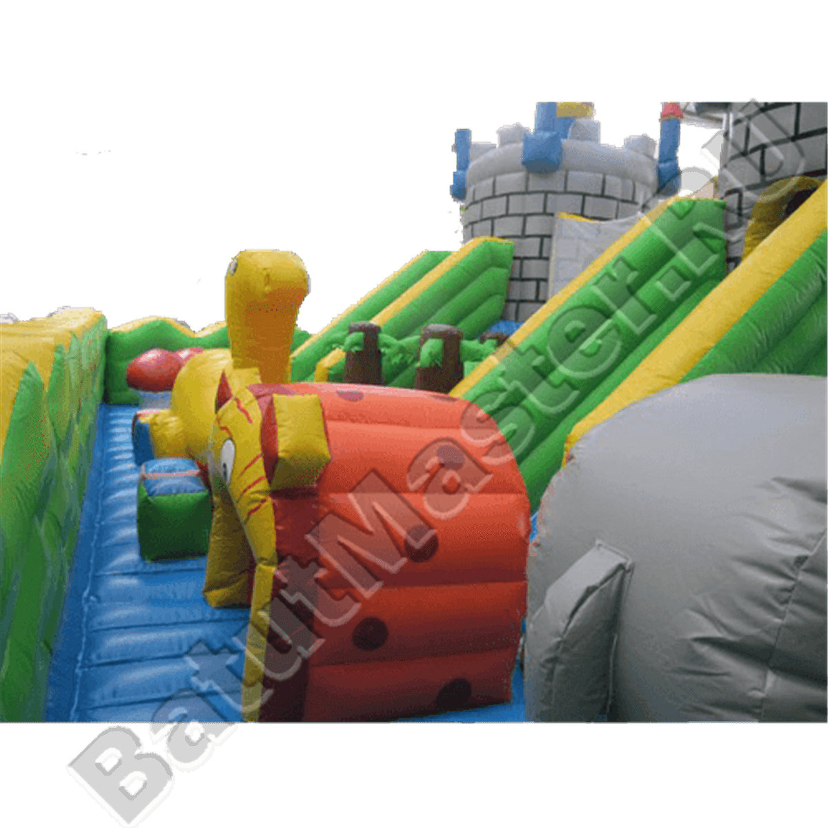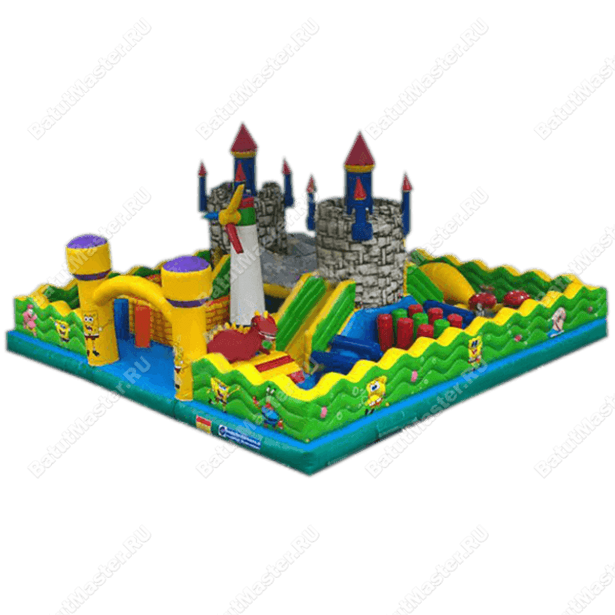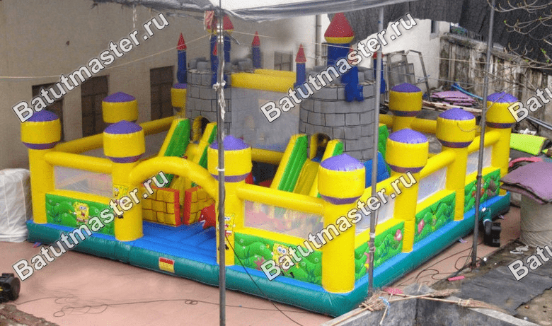 Надувной батут с многофункциональным устройством выполнен в виде квадратной надувной площадки со сторонами 20 на 20 м. Коммерческий аттракцион предназначен для бизнеса, поэтому внутри себя он имеет множество игровых форм и несколько развлекательных зон. Внешний периметр батута обнесен надувным зеленым ограждением, а на фасадной стене имеется высокая арка, созданная при помощи двух желтых башен. Внутри батута будет встречаться еще множество башен, все они будут размещаться в центральной части аттракцион: выходят из двух крепостей и поднимаются вверх синими столбами, а их окончания украшены красными шпилями.
