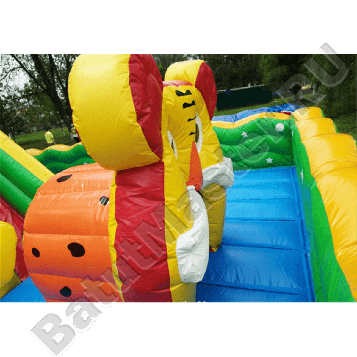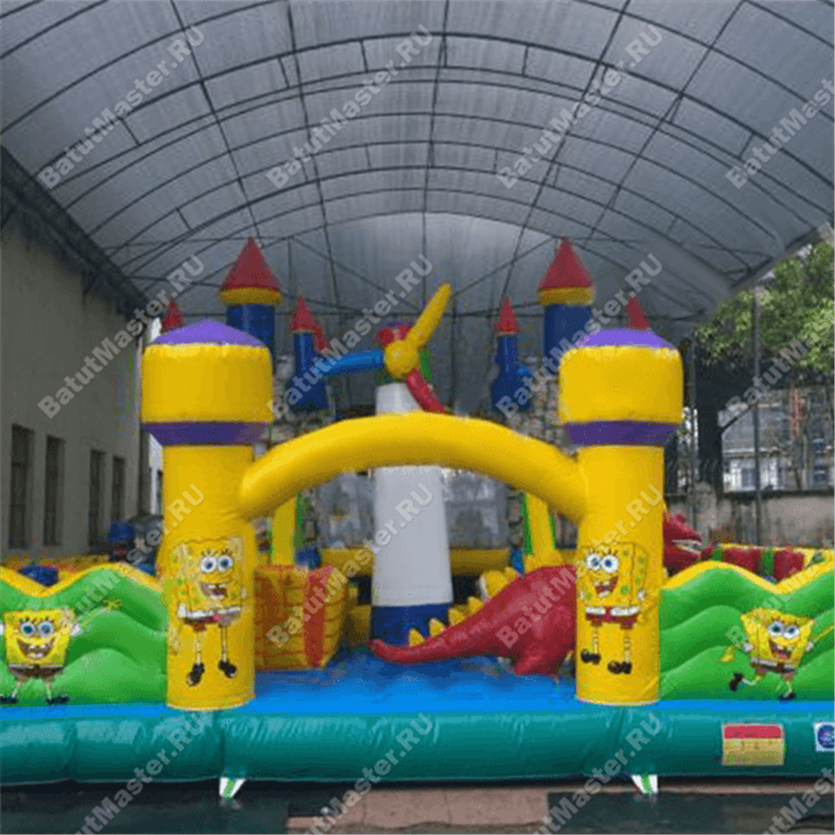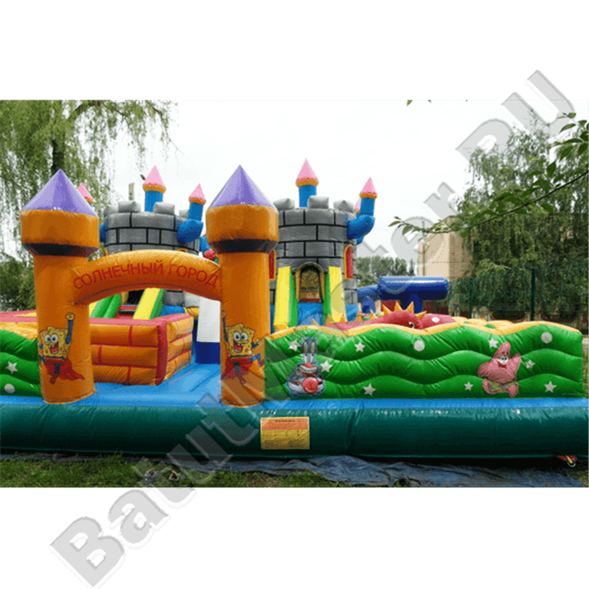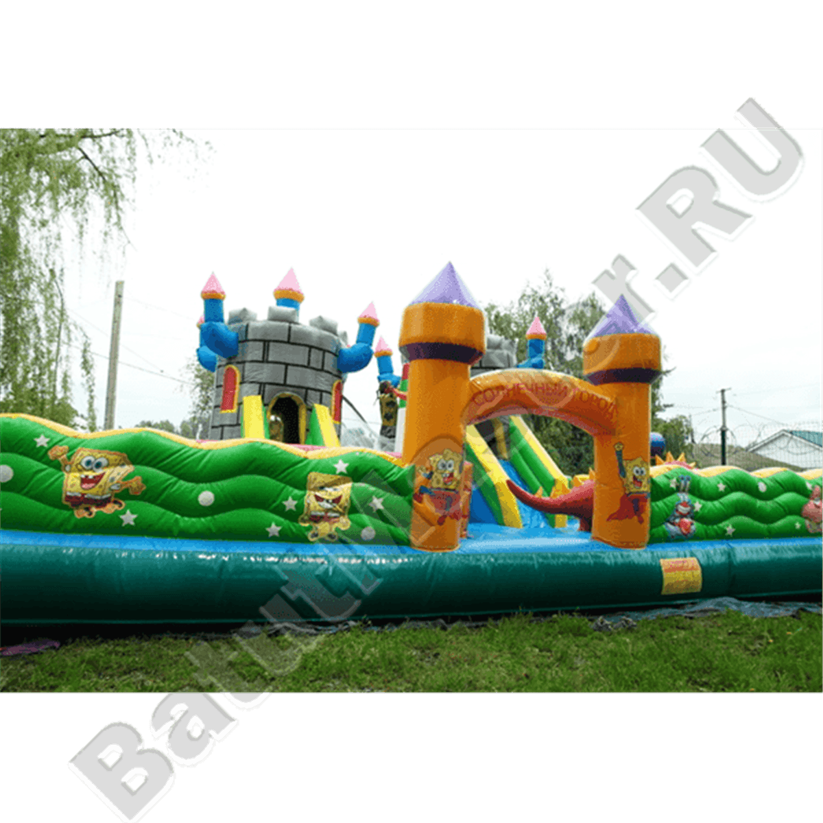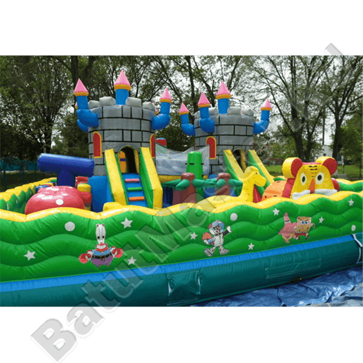 Надувной батут с многофункциональным устройством выполнен в виде квадратной надувной площадки со сторонами 20 на 20 м. Коммерческий аттракцион предназначен для бизнеса, поэтому внутри себя он имеет множество игровых форм и несколько развлекательных зон. Внешний периметр батута обнесен надувным зеленым ограждением, а на фасадной стене имеется высокая арка, созданная при помощи двух желтых башен. Внутри батута будет встречаться еще множество башен, все они будут размещаться в центральной части аттракцион: выходят из двух крепостей и поднимаются вверх синими столбами, а их окончания украшены красными шпилями.