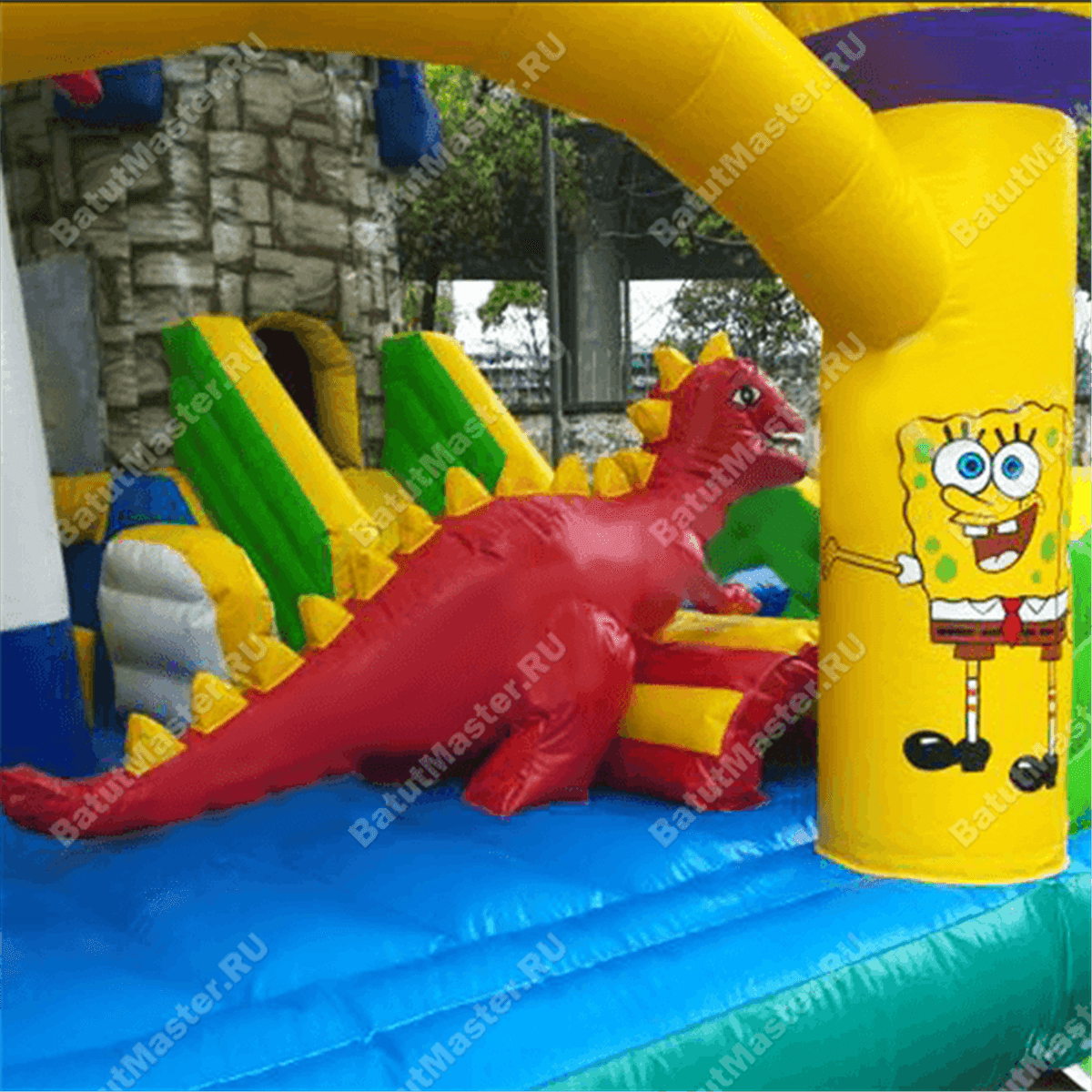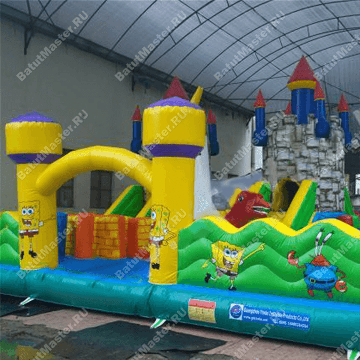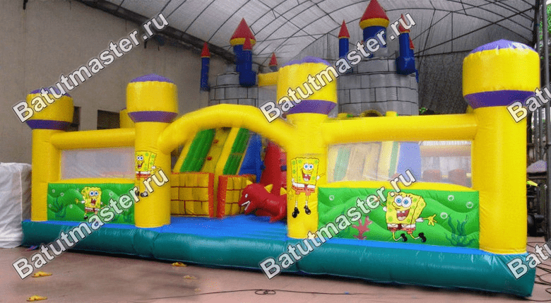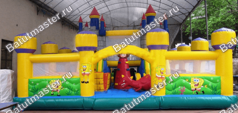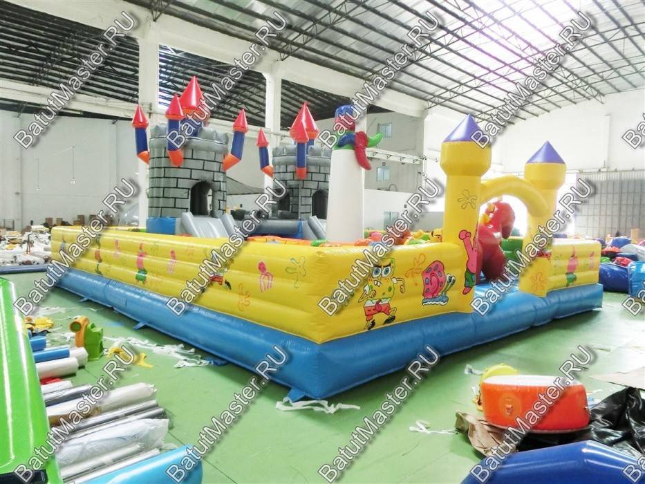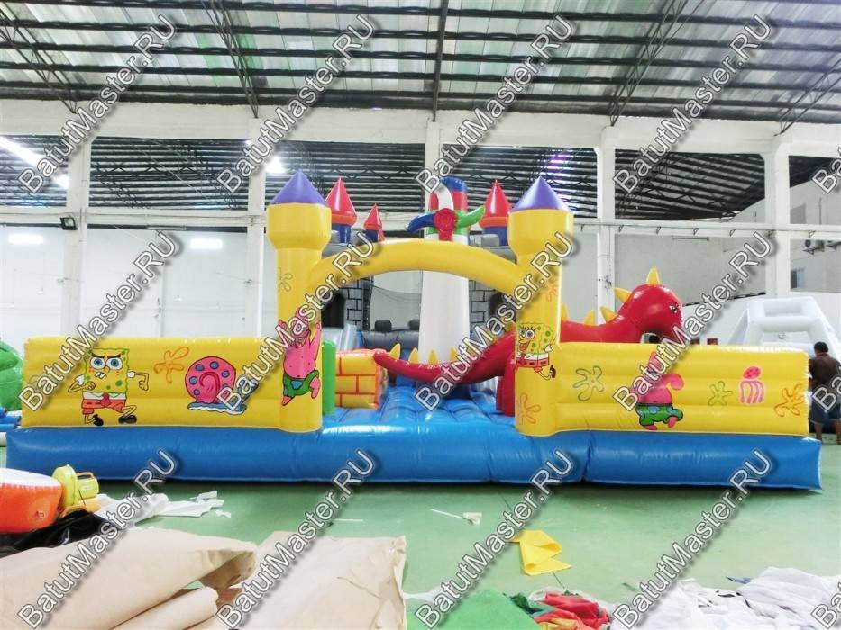 Из каждой крепости вниз опускается по горке, между собой эти «средневековые» конструкции соединены мостом, под которым существует еще одна игровая зона. Левая горка, опускаясь на нижнюю надувную платформу, попадает внутрь настоящего лабиринта из мягких стен, который ребенок обязательно должен будет пройти. Помимо центральной зоны батут поделен еще на несколько частей и каждая оборудована определенной категорией игровых фигур, например: разноцветные столбики, огромный дракон, скалодром, лазы и тоннели, пальмы и мельница.