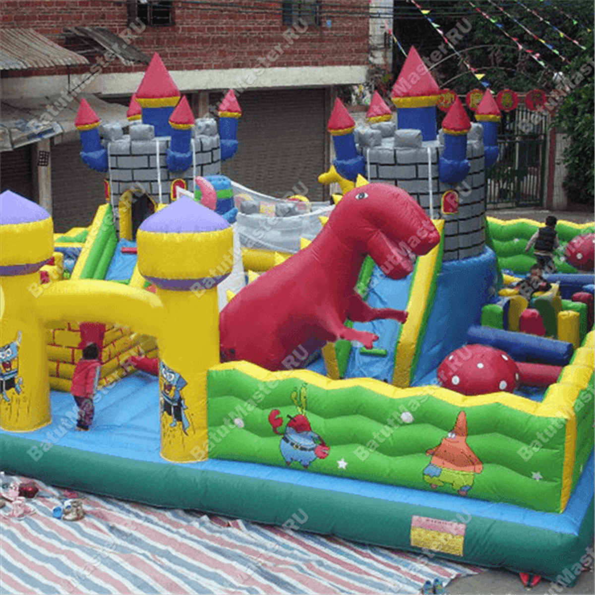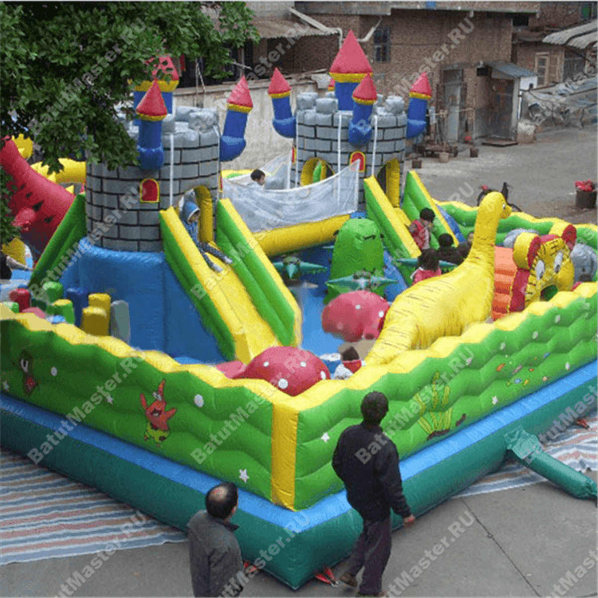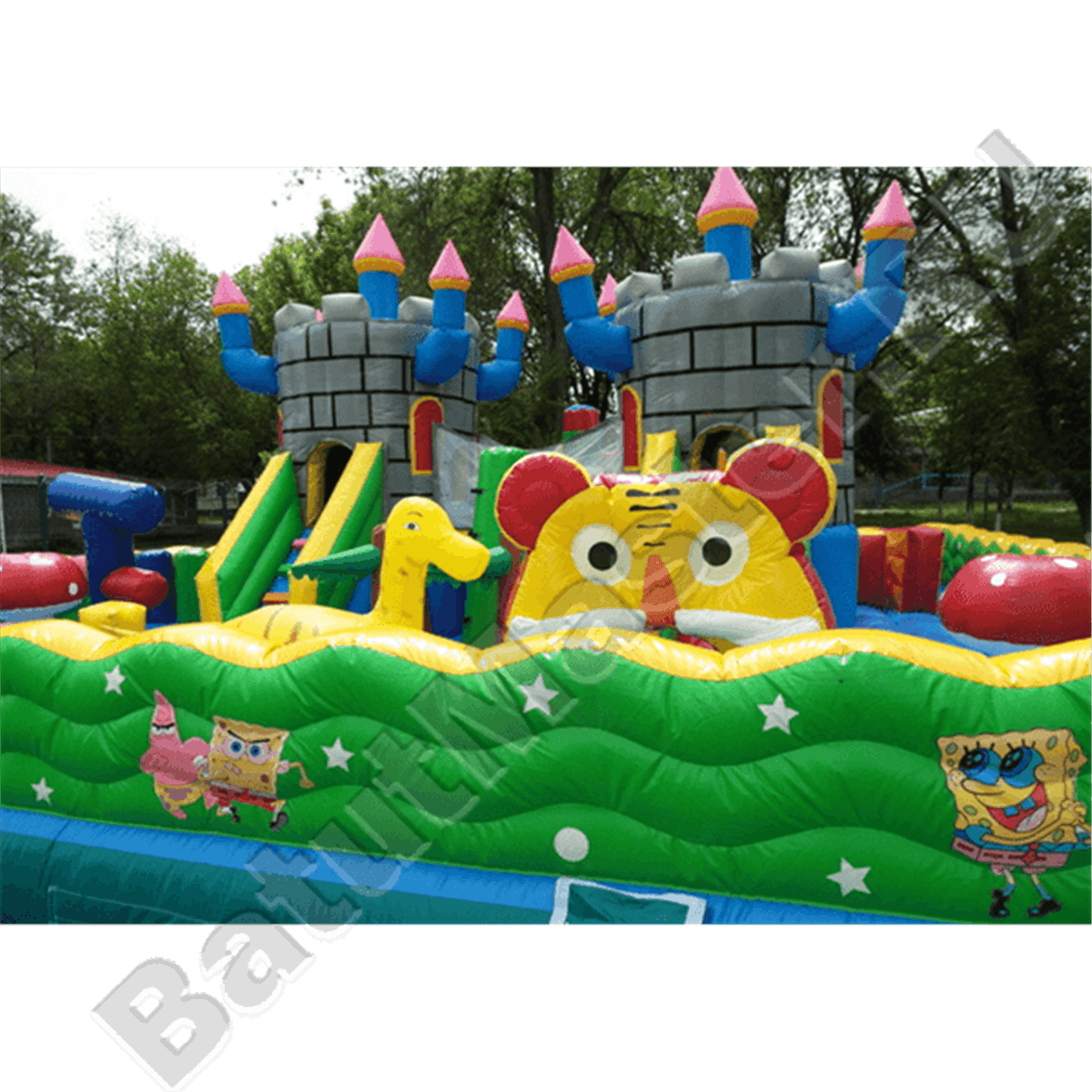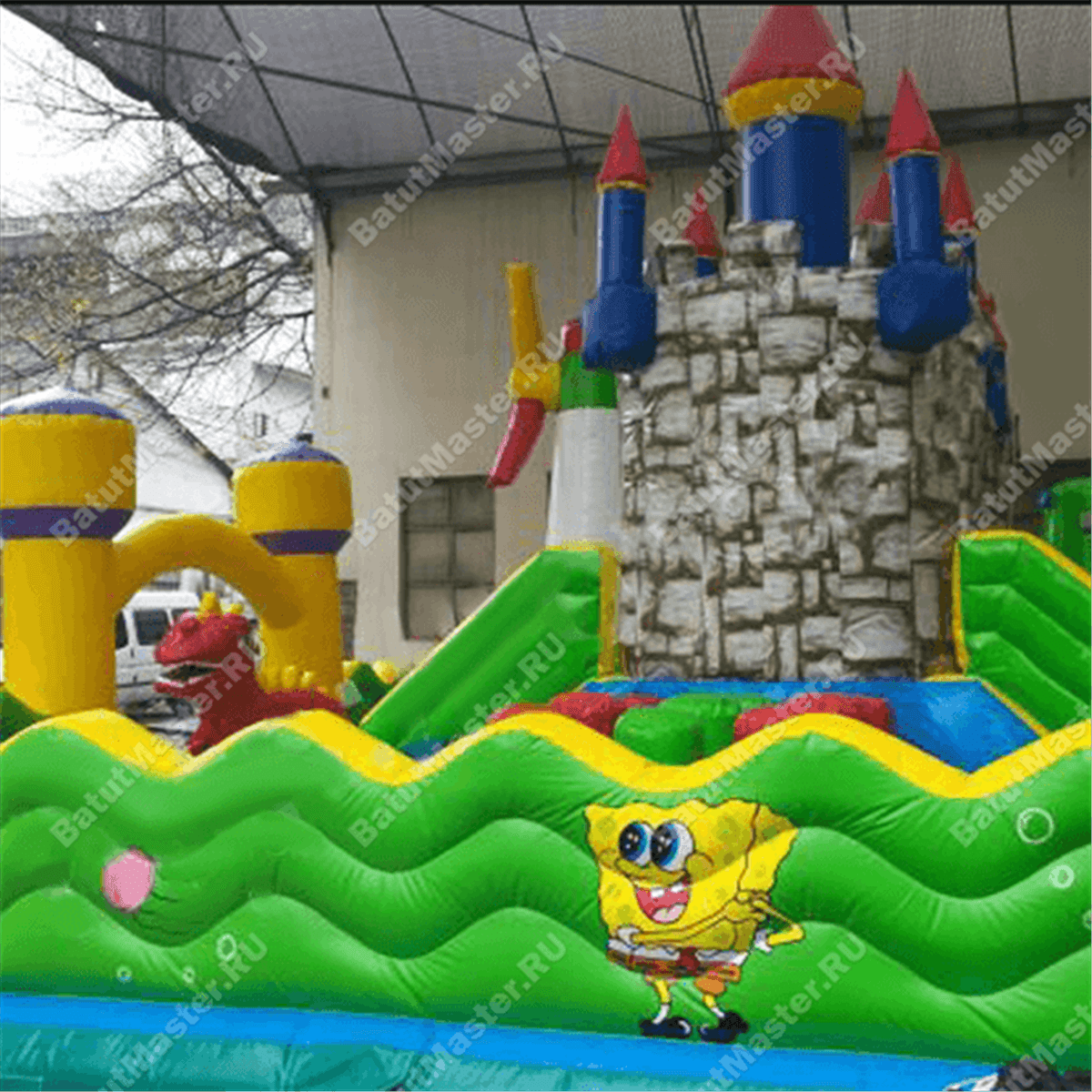 Из каждой крепости вниз опускается по горке, между собой эти «средневековые» конструкции соединены мостом, под которым существует еще одна игровая зона. Левая горка, опускаясь на нижнюю надувную платформу, попадает внутрь настоящего лабиринта из мягких стен, который ребенок обязательно должен будет пройти. Помимо центральной зоны батут поделен еще на несколько частей и каждая оборудована определенной категорией игровых фигур, например: разноцветные столбики, огромный дракон, скалодром, лазы и тоннели, пальмы и мельница.