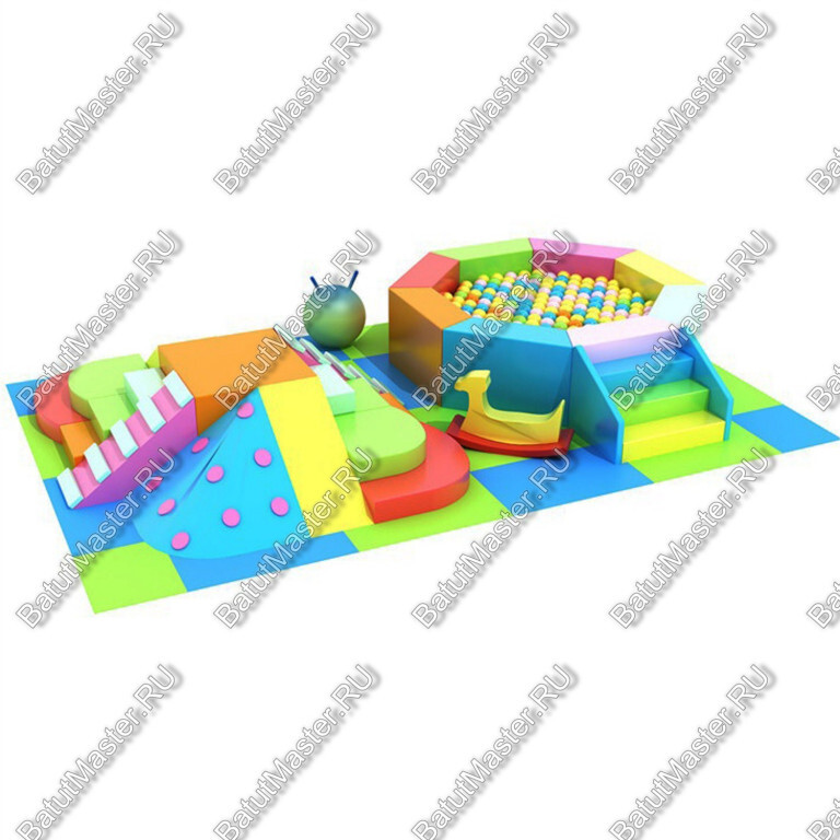 Игровой комплекс насчитывает всего два элемента: лестница со скалодромом и сухой бассейн. Площадь комплекса 4900 на 3500 мм, высота - 1400 мм. Комната не имеет ограждающих стенок. Просто на горизонтальной площадке размещены игровые элементы. Площадка, предназначенная для установки этого комплекса должна обладать выровненной горизонтальной поверхностью. Отлично, если вы сумеете установить данное игровое оборудование внутри более масштабной игровой комнаты или лабиринта. Таким образом, все стороны комплекса будут защищены.
