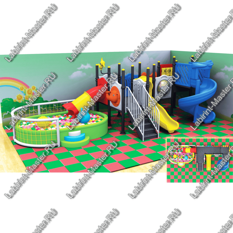 Зона с бассейном для шариков: Специальная зона с мягкими разноцветными шариками создает дополнительное игровое пространство, способствующее развитию тактильных ощущений и моторики.