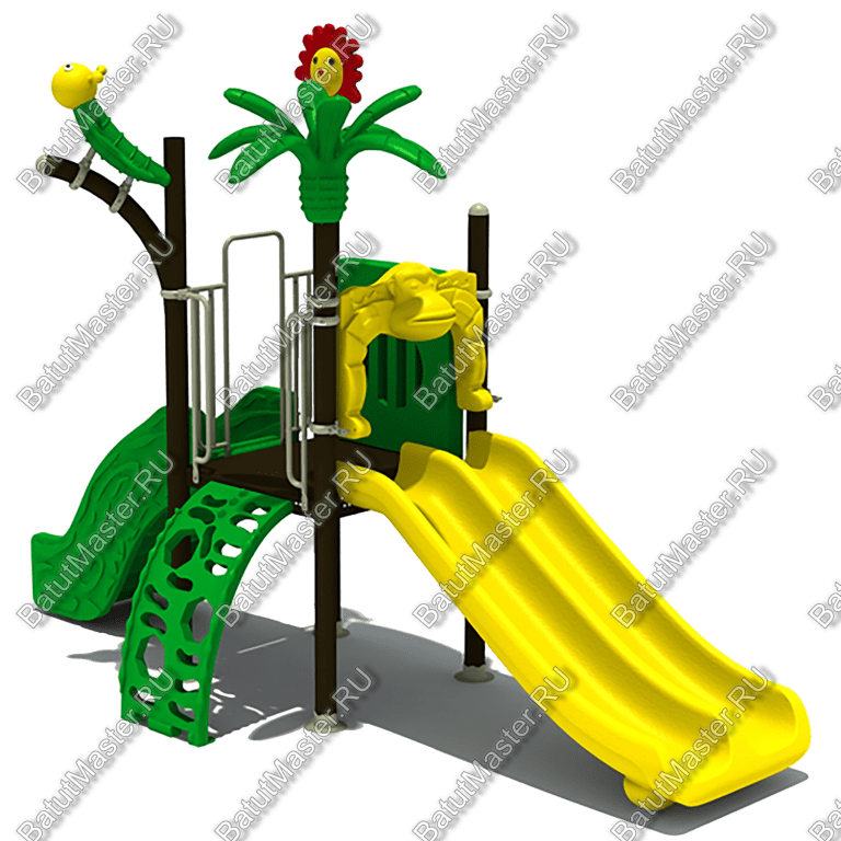 - Декоративные пальма, солнышко и гусеничка — создают тематическую атмосферу лета и тени, делая площадку более привлекательной для детей.