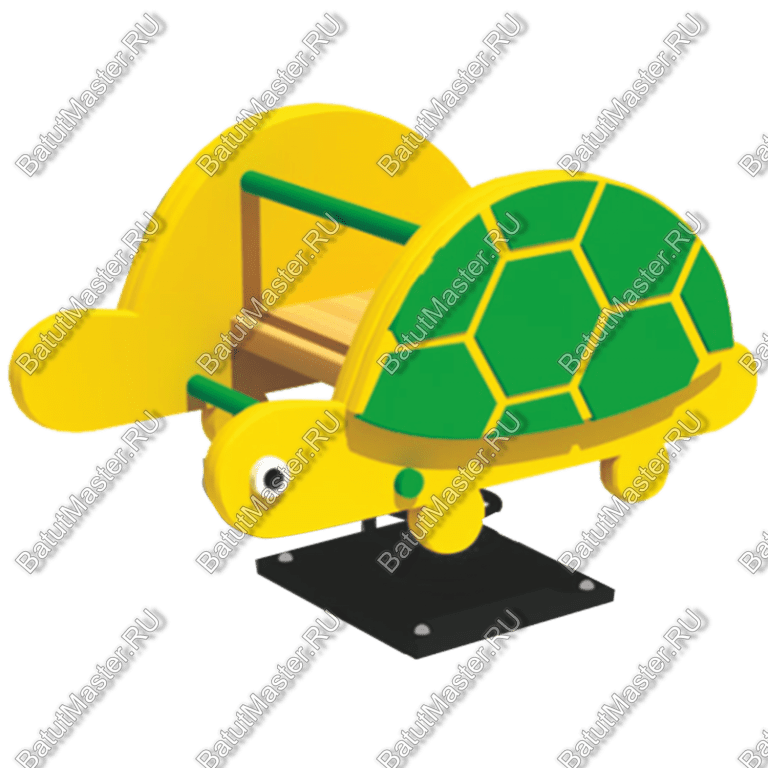 Боковые стенки качалки в виде черепахи окрашены желтой и зеленой краской. Но зеленым цветом покрыты лишь частички панциря. Обе стороны изготовлены из прочной фанеры, которая проходит несколько этапов шлифования, поэтому качалке обеспечивается идеально гладкая поверхность. Само сиденье изготавливается из специального полиэтилена, который обладает способностью сохранять в себе тепло даже в самую холодную погоду. Именно поэтому сидеть на такой качалке никогда не бывает холодно.