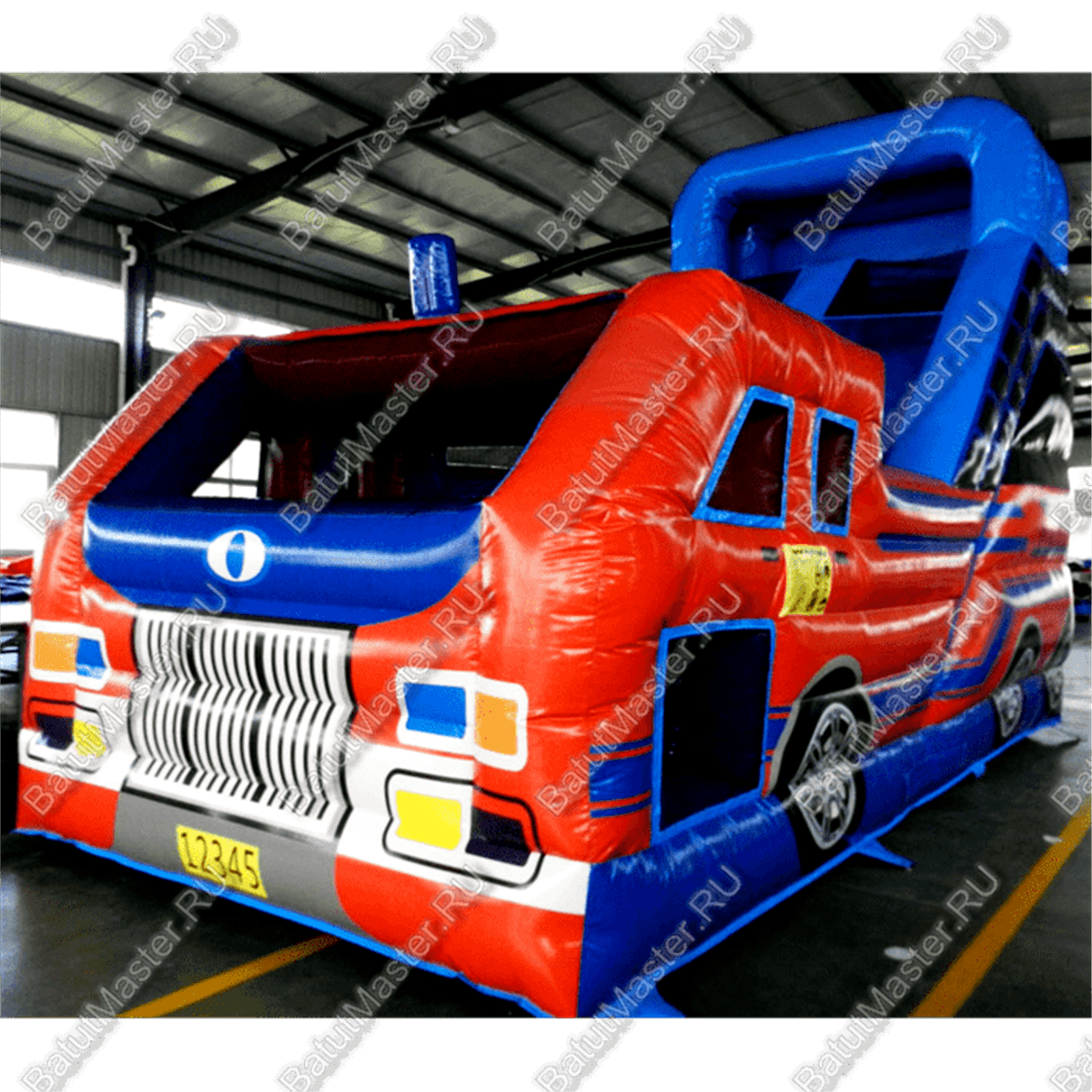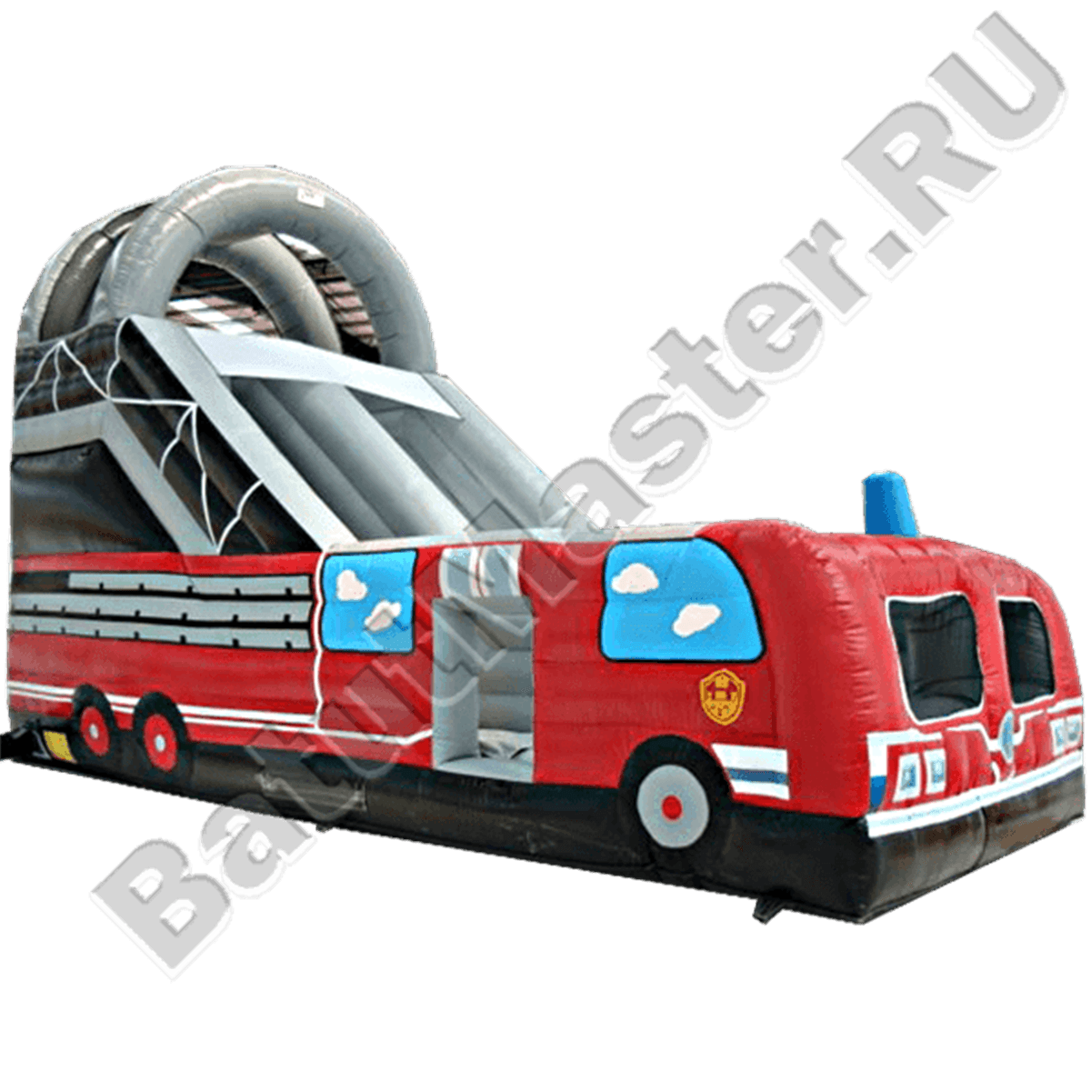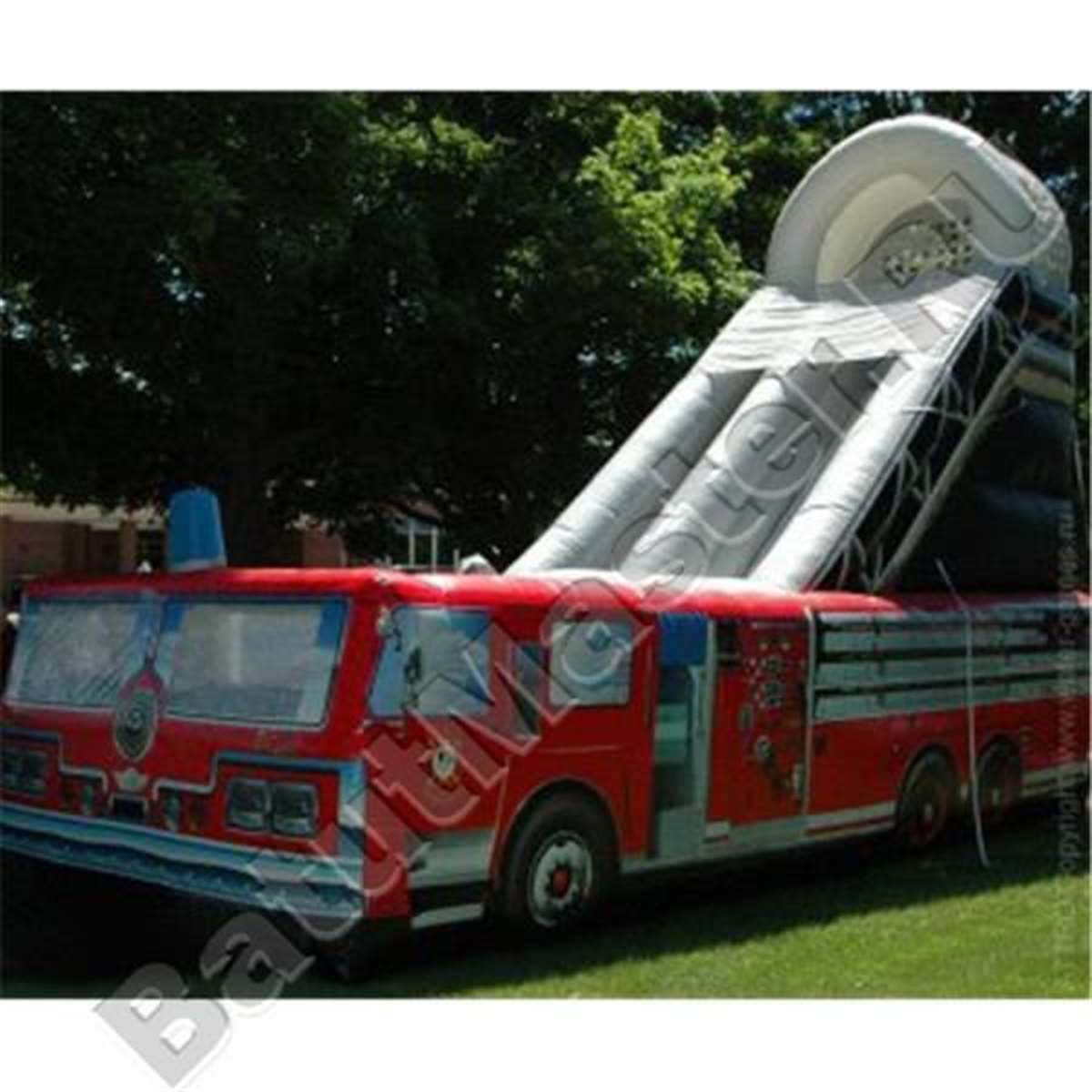 Ярко-красный корпус тематической надувной горки с боковым входом, точная передача всех особенностей этого автомобиля – помощника с крутой горкой в глубине аттракциона и соблюдением правил безопасности растопят сердце и кошелек многих пап и мам.