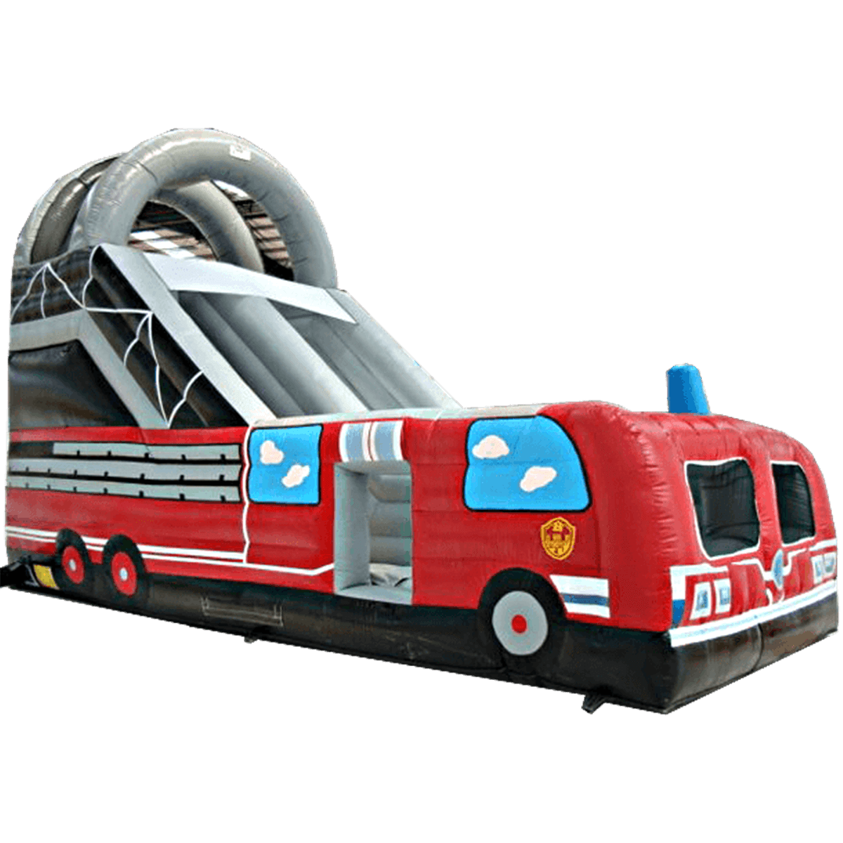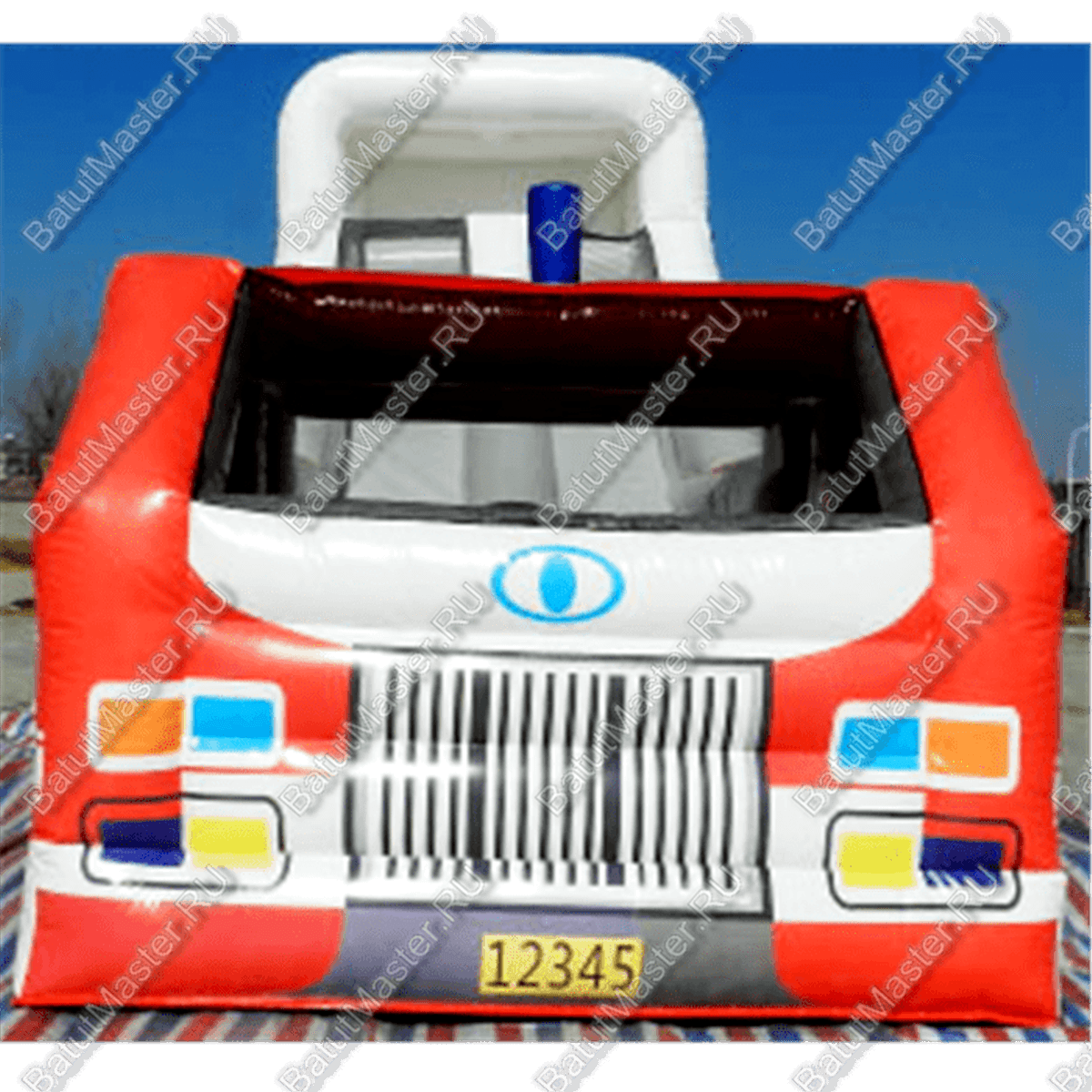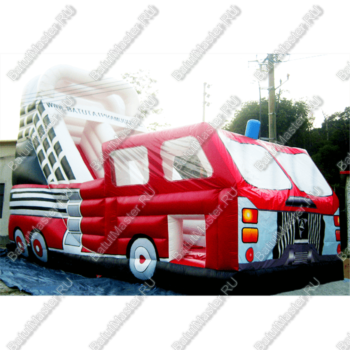 Ярко-красный корпус тематической надувной горки с боковым входом, точная передача всех особенностей этого автомобиля – помощника с крутой горкой в глубине аттракциона и соблюдением правил безопасности растопят сердце и кошелек многих пап и мам.