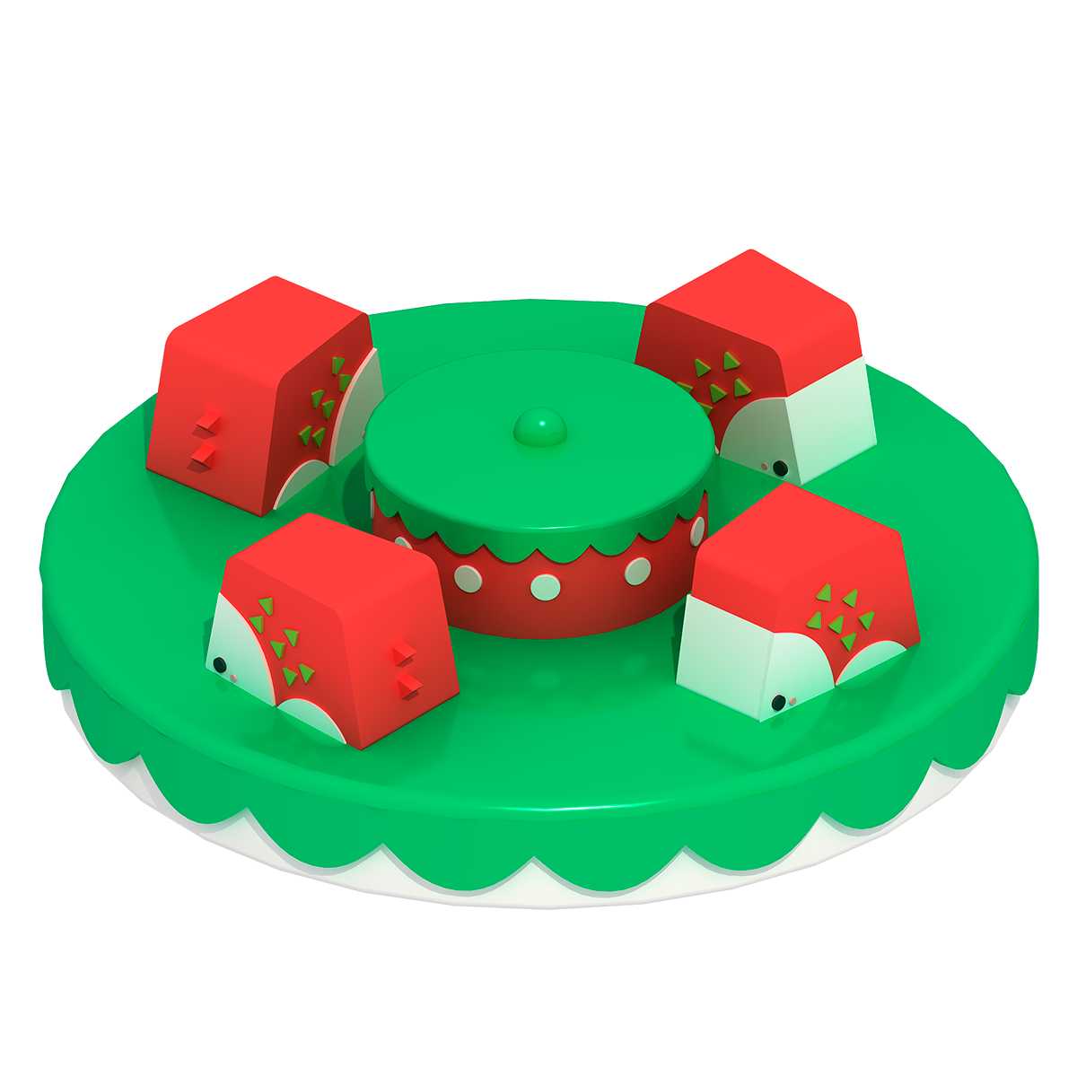 Особенностью этой карусели является её яркий и привлекательный внешний вид: сочетание красных, зеленых и белых оттенков в дизайне привлекает внимание и создаёт атмосферу веселья. Она идеально подходит для использования в детских развлекательных центрах, тематических парках, игровых комнат, а также на праздниках и фестивалях.