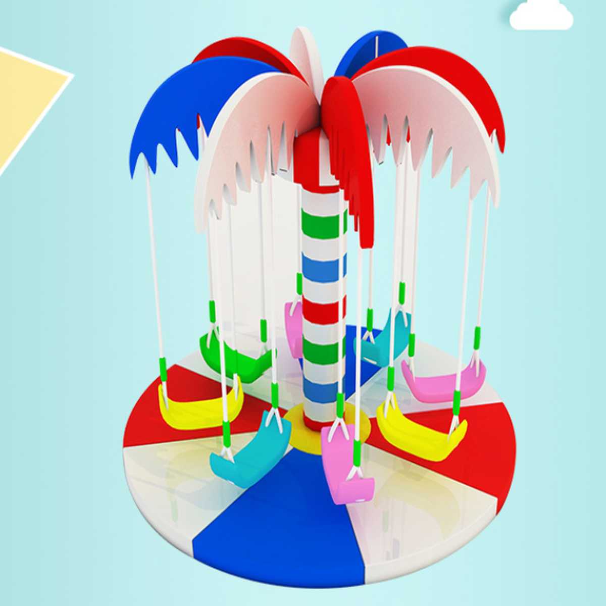 Карусель Кокосовая пальма "Фантазия" это уникальный игровой аттракцион, который подарит детям радость движения и свободу. Его ключевая особенность заключается в том, что дети сами отталкиваются, сидя на мягких и удобных посадочных местах в виде подвесных тарзанок, управляя движением и интенсивностью раскачивания. Это развивает у малышей физическую активность, координацию движений и ощущение контроля, что делает игру ещё более увлекательной и активной. Уникальный тропический дизайн с пышными разноцветными "листьями пальмы" и яркими подвесными сидениями сделает эту карусель центром детского внимания. Ее можно установить в семейных развлекательных центрах, аквапарках, торговых залах, детских садах и на открытых площадках, если соблюдаются условия хранения и монтажа.