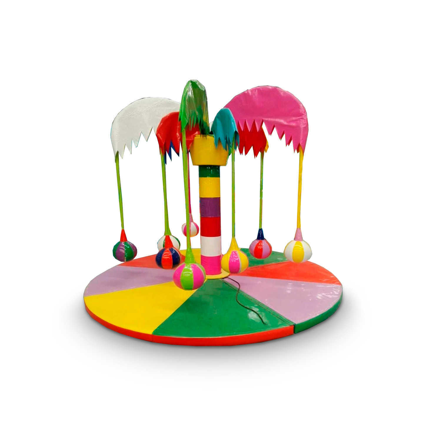 Аттракцион представляет собой конструкцию с центральным стволом, от которого свисают мягкие шары, напоминающие кокосы. Шары крепятся на прочных подвесах и вращаются вместе с конструкцией, создавая эффект динамичной игры. Карусель рассчитана на одновременное участие до 9 детей, что делает ее популярным решением для семейных развлечений.