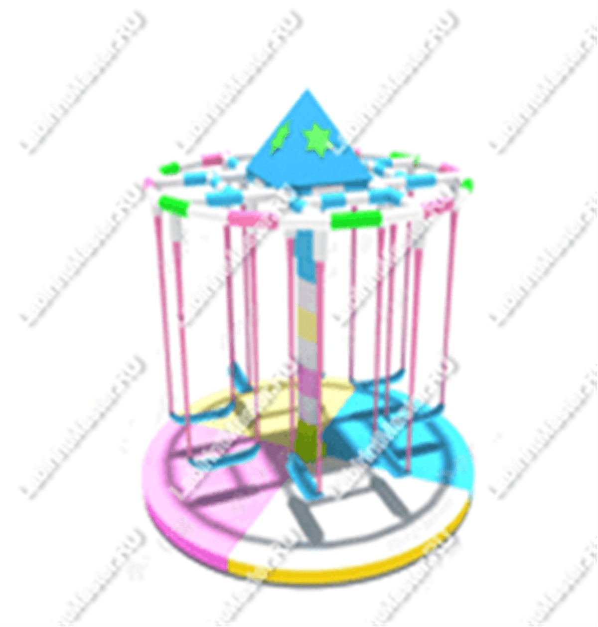 Карусель рассчитана на одновременное использование восьми детьми, обеспечивая удобство и комфорт благодаря посадочным местам в виде подвесных кресел и скамеек. Электропривод обеспечивает плавное вращение с оптимальной скоростью, делая поездку безопасной и захватывающей.