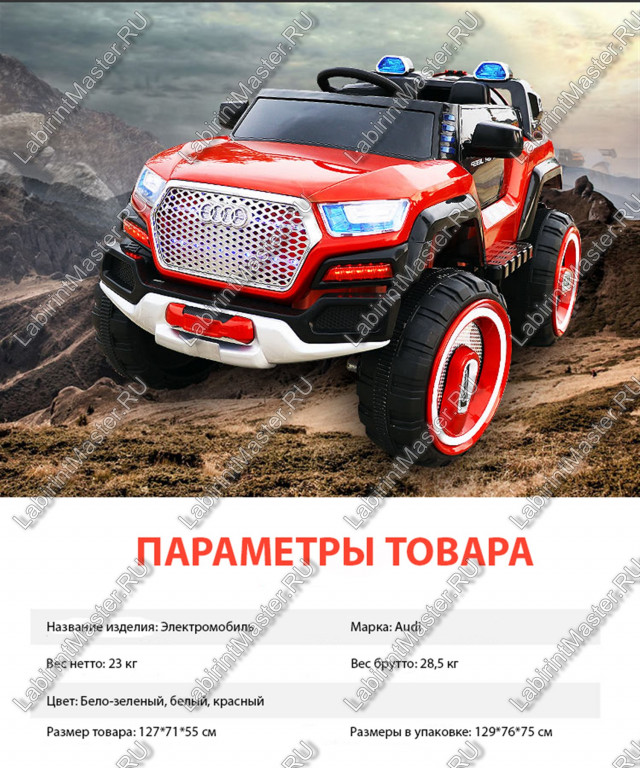 Игрушечный представитель немецкой марки «Audi» непременно понравится детям. Внедорожник имеет большие хорошо проходимые колеса из высококачественной резины. Диски красно-белые, в цвет кузова, таким образом дизайн получился еще интереснее. Кузов также выполнен в красном и белом цветах, что подходит как мальчикам, так и девочкам. Яркие светодиодные фары позволят кататься даже в ночное время. Открывающиеся двери со стеклом, удобное кресло из экокожи. Ремни безопасности создают дополнительную безопасность на дороге. Тонированное переднее стекло, зеркала заднего вида, вместительный багажник, несколько отсеков в салоне для мелочей – здесь есть абсолютно все. С встроенной магнитолой кататься будет еще веселее, тем более, что электрокар вмещает сразу двух детей: водителя и пассажира. Кузов выполнен из качественного твердого пластика. Модель не имеет острых углов, так, что за безопасность ребенка переживать не стоит. Для удобства родителей в комплекс входит пульт управления. Так они смогут ребенку помочь с управлением, что даст ему привыкнуть к автомобилю. Такие электрокары подходят для сдачи в прокат, а также можно заняться их продажей.