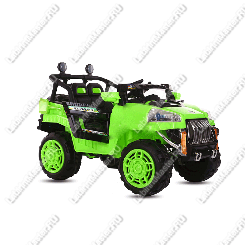 Данная модель электромобиля представляет собой спортивный внедорожник с множеством интересных опций. Первое, что бросается в глаза – это его ярко-зеленый цвет. Он сделает прогулки мальчишек еще веселее и познавательнее. Детям с трехлетнего возраста интересно будет ощутить себя настоящими водителями, а также играть с различными светящимися элементами управления, рычагом переключения скоростей. Не менее интересно запустить машинку, ведь она издает звук настоящего мотора, нажать педаль газа и поехать. Двигатель разгоняет автомобиль до 3 км/ч.