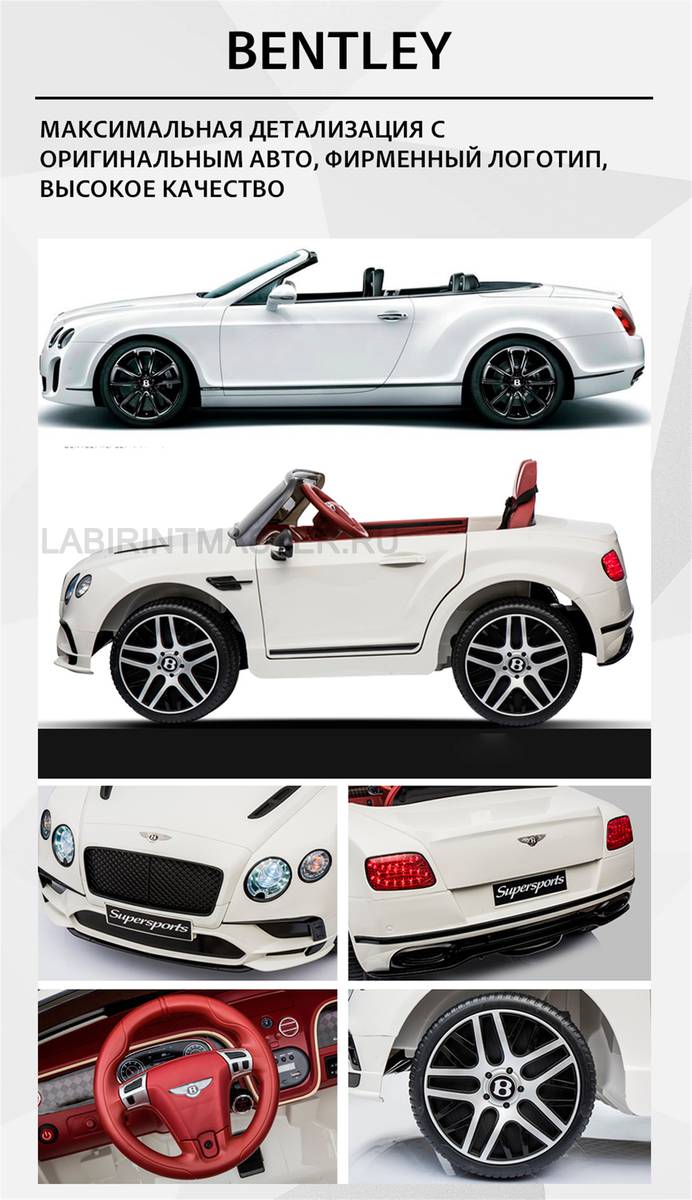 Каждому известно, что детский электромобиль «Bentley» - это воплощение современности, изысканности и уникальности. Все это есть в такой машинке для детей потому, что она сделана в точном соответствии со своим прототипом. С первого взгляда может показаться, что кузов выполнен в сдержанном стиле, однако он по-своему элегантен и роскошен. Садясь за руль юный гонщик сразу почувствует комфорт и удобство вождения. Так, резиновые колеса позволяют машинке кататься практически бесшумно, а высокий клиренс отлично ведет себя на небольшом бездорожье. Современная магнитола позволяет вставить флэш носитель и слушать любимые мелодии или радио. Клаксон здесь расположен на руле, а рычаг переключения скорости справа, то является очень удобным.