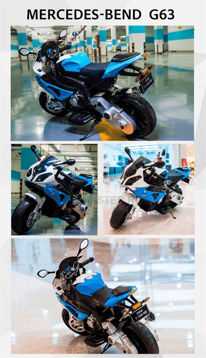 В данном исполнении представлен детский электромотоцикл BMWS1000RR. У него имеется встроенный двенадцативольтный аккумулятор, что говорит о достаточной мощности такого транспорта. Двухколесный агрегат для передвижения оснащен широкими резиновыми колесами, а то значит, что он устойчив будет на поворотах. Максимальная его скорость 7 километров в час.