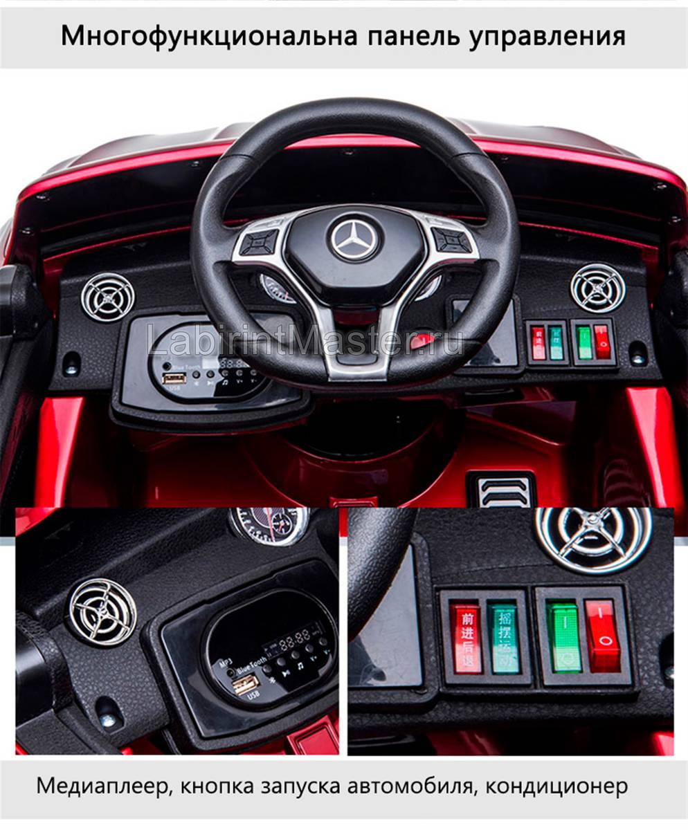 Детский электромобиль «Mercedes-Benz» дотошно передаёт всё красоту и изящество оригинального автомобиля. На такой электромобиль засмотрится не только ребёнок, но и его родители, и это не удивительно. Кузов машины сияет глянцевой красной краской, а хромированные детали и огромные колёсные диски сверкают на солнце. На лобовой решётке радиатора гордо красуется большой фирменный знак «Mercedes» - трёхлучевая звезда. Эта модель лицензирована, и поэтому тут проработана каждая мелочь, что точно понравится ребёнку. Большие застеклённые фары ярко светятся светодиодами, а, как известно, детям очень это нравится.
