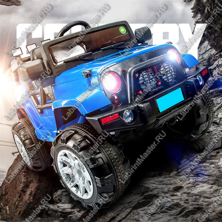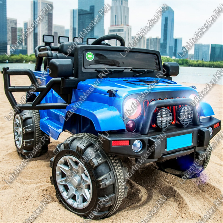 Опираясь на открытую дверь, выполненную в нестандартном стиле, и ступеньку, ребёнок сможет без проблем оказаться в салоне. Далее он садится на удобное широкое сидение и берётся за руль, что расположен выше уровня стёкол. Стоит ему нажать на педаль, как электромобиль тронется в путь. Скорость он держит небольшую, едет плавно. Кататься на таком джипе можно и по асфальту, и по песку, и по земле. Благодаря большим и прорезиненным шинам этому электромобилю ничего не страшно.