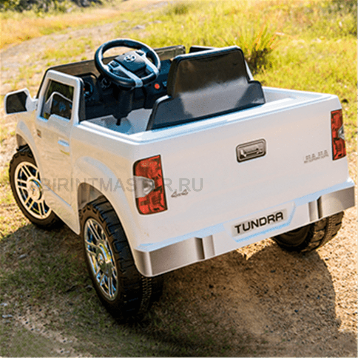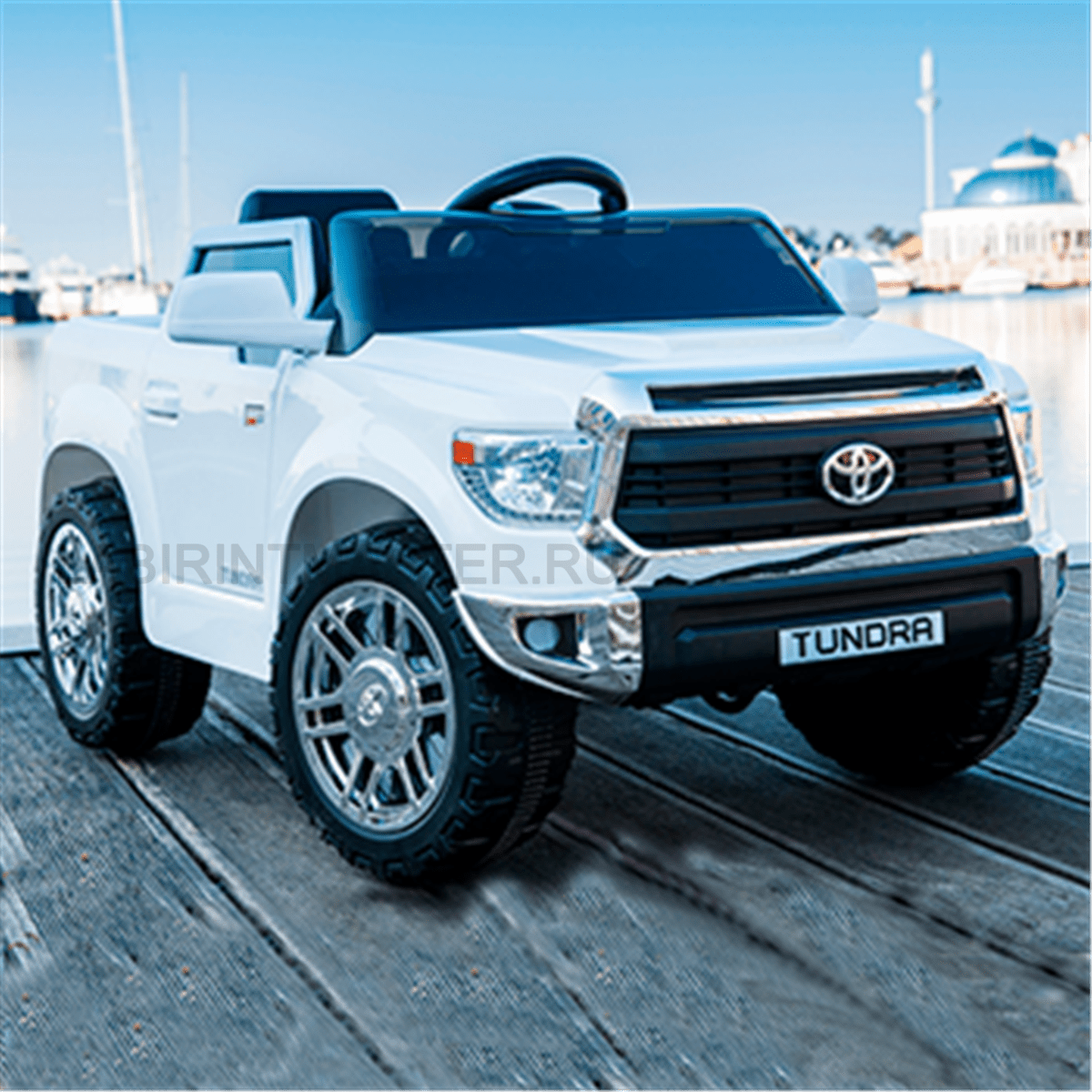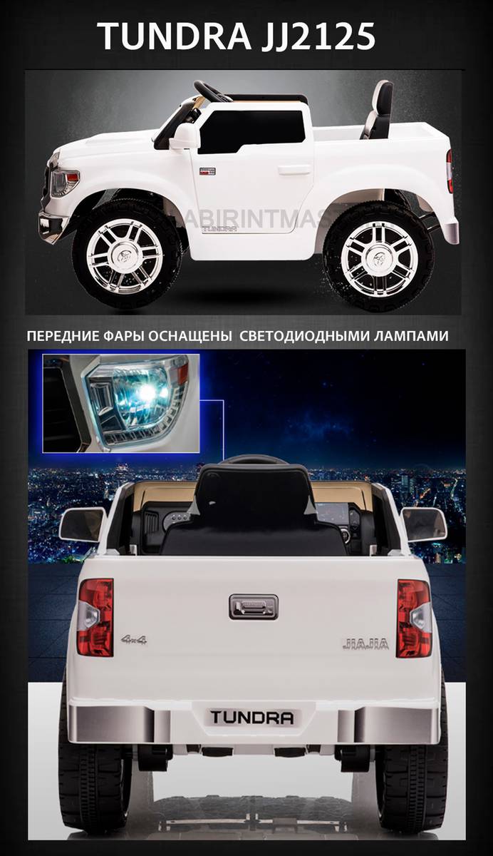 Детский электромобиль «Toyota Tundra» JJ2125 представлен в белом цвете. Она подойдет не только мальчикам, но и юные леди будут не прочь прокатиться на таком средстве передвижения. Чтобы завести машинку, нужно наддать кнопку справа от руля, после чего выжать педаль газа. Она также является и тормозом, если ее отпустить. Открывающиеся двери позволяют легко забраться в салон. Стоит отметить, что внутри на них стоят дополнительные защелки.
