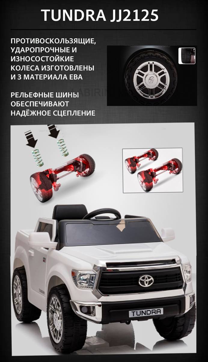 Детский электромобиль «Toyota Tundra» JJ2125 позволит с легкостью преодолевать бездорожье, ведь это мощный большой транспорт для юных непосед. Несмотря на то, что это машинка для малышей, она является узнаваемой, так как сделана в точности, как реальный авто для взрослого человека. Широкие колеса с качественной резиной устойчивы на мокром асфальте, а также прекрасно выбираются из камней, песка и небольших луж.