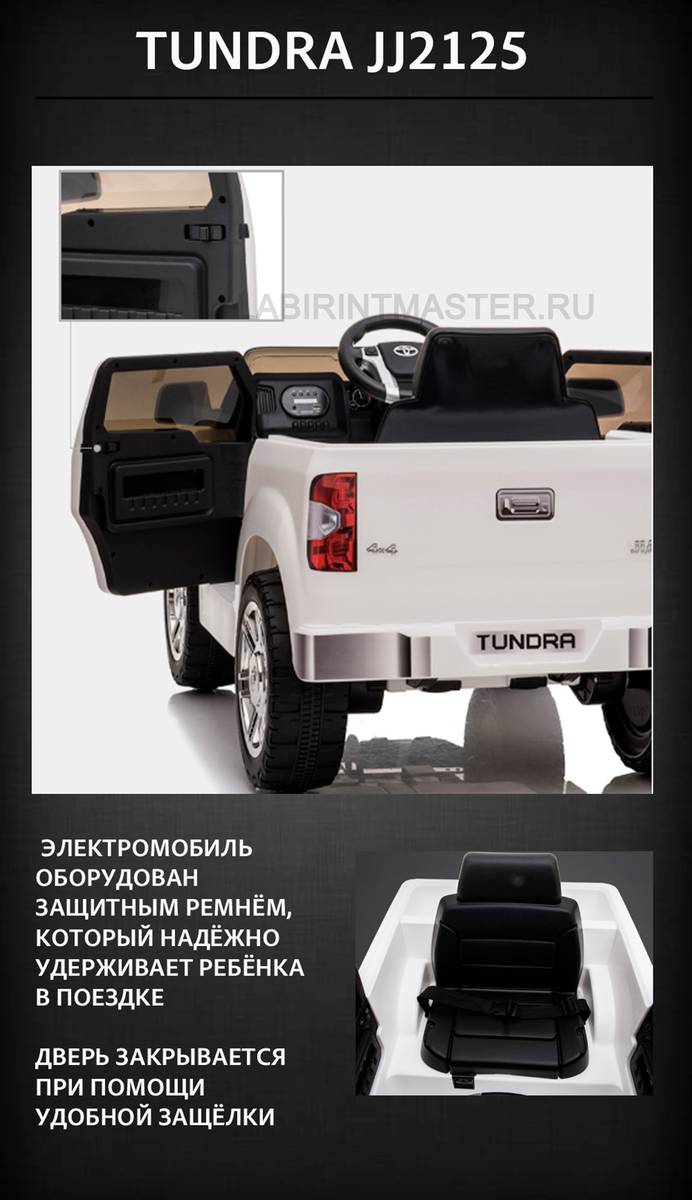 Детский электромобиль «Toyota Tundra» JJ2125 представлен в красном цвете, поэтому за его габариты он понравится мальчишкам, а красный цвет непременно привлечет внимание юных леди. Удобный руль и эргономичное сиденье с большим подголовником позволят только наслаждаться вождением. Все опции здесь более чем понятны и даже самый маленький ребенок сможет их быстро освоить.