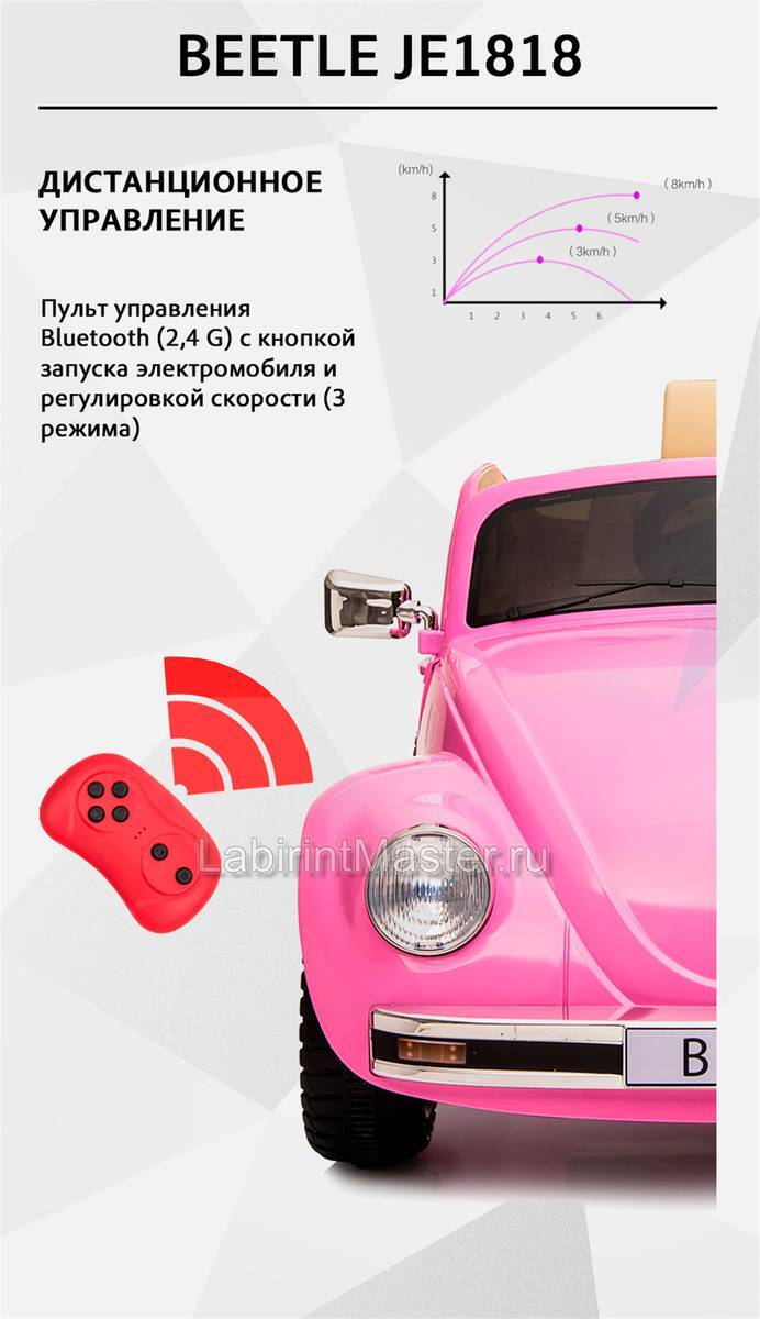 Детский электромобиль «Volkswagen Beetle» JE1818 станет отличным подарком для юных принцесс. Он компактный и оригинальный, в прочем, как и реальный автомобиль. Небольшие его габариты позволят быстрее привыкнуть к управлению. Яркие фары отлично освещают дорогу в темноте и от этого появляется еще больший комфорт во время катания. Зеркала заднего вида помогают парковаться и следить за обстановкой сзади.