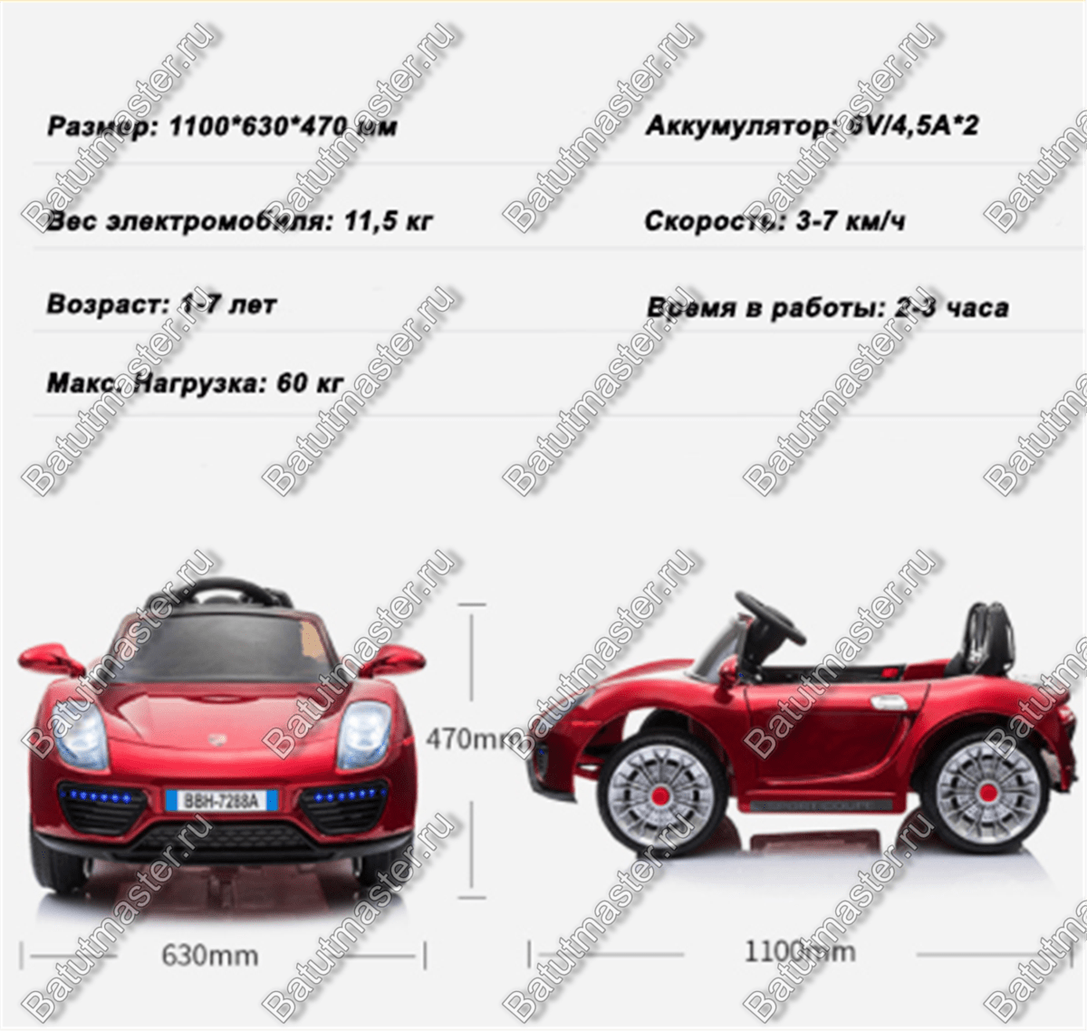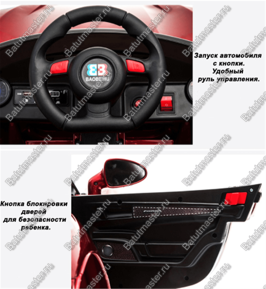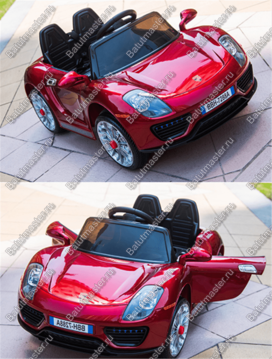 Детский электромобиль «ВВH 7288A» в расширенной комплектации покрашен глянцевой краской красного цвета, которая устойчива к сколам и очень красиво блестит на солнце. Колеса из резины не буксуют на мокрой дороге, а также не доставляют шума. Зеркала заднего вида и не искажают обзор, а открывающиеся двери помогут быстрее попасть внутрь, при этом они оснащены внутренними фиксаторами.