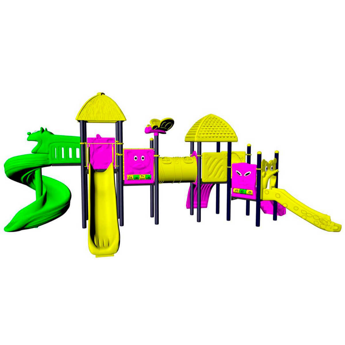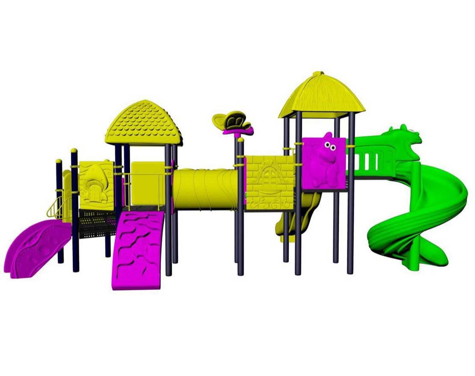 - Горки, крыши выполнены из пищевого полиэтилена низкого давления (ПНД), который не выгорает на солнце и сохраняет яркие цвета до 15 лет.
