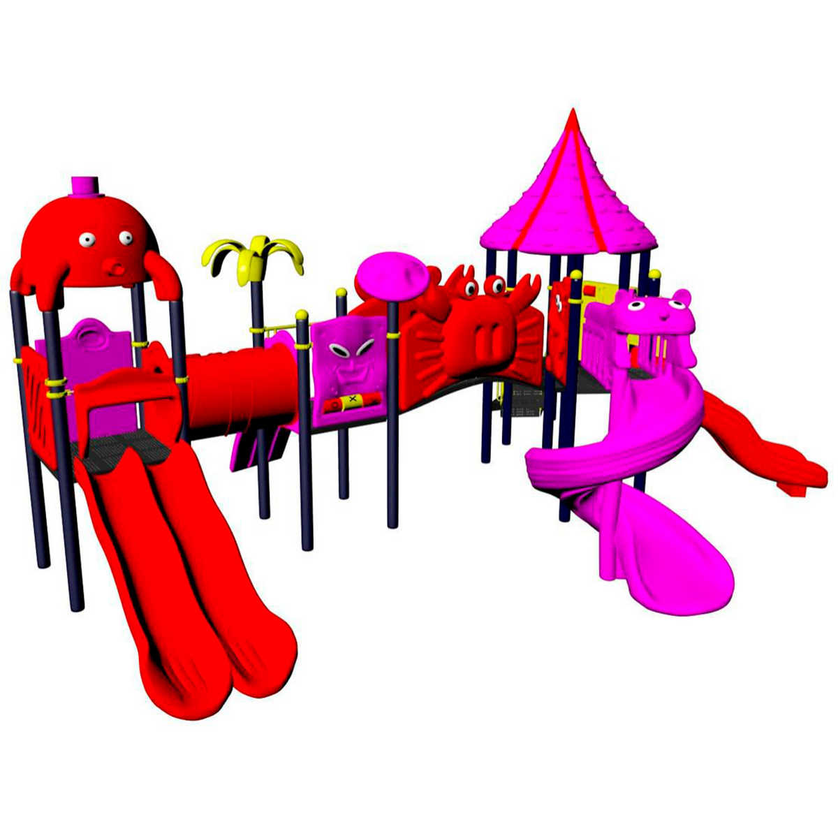 - Горки, крыши выполнены из пищевого полиэтилена низкого давления (ПНД), который не выгорает на солнце и сохраняет яркие цвета до 15 лет.