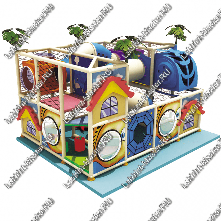Нижний этаж лабиринта украшен баннерами с иллюминаторами в виде глаз и изображениями домиков, создавая эффект реального дома Спайдермена. Верх второго этажа обрамлен декоративными листьями пальм, а сам каркас выполнен из белых труб, что придает конструкции легкость и стильный внешний вид. Открытые зоны затянуты сеткой для безопасности, а внутренние элементы продуманы для максимального комфорта и интереса детей.