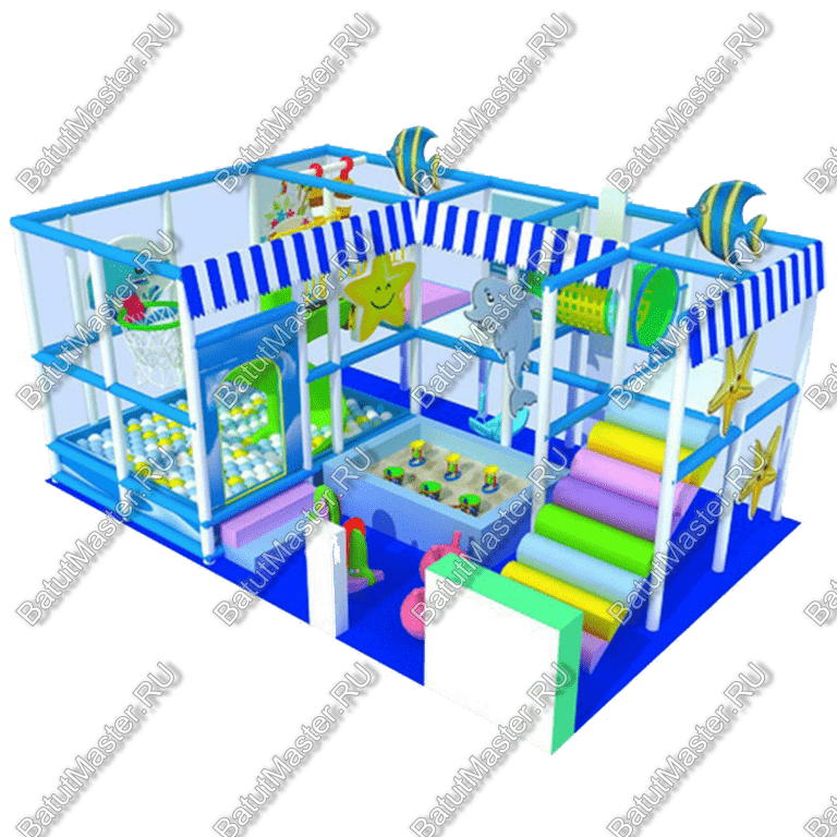 Разноуровневые конструкции оформлены в виде волнистых туннелей и мягких переходов, создавая ощущение морского течения. Винтовая горка выполнена в виде радужной волны, а сухой бассейн напоминает морскую лагуну, наполненную пенящимися пузырьками. Тканевые перегородки и мягкие элементы выполнены из прочного и безопасного материала, легко поддающегося чистке.