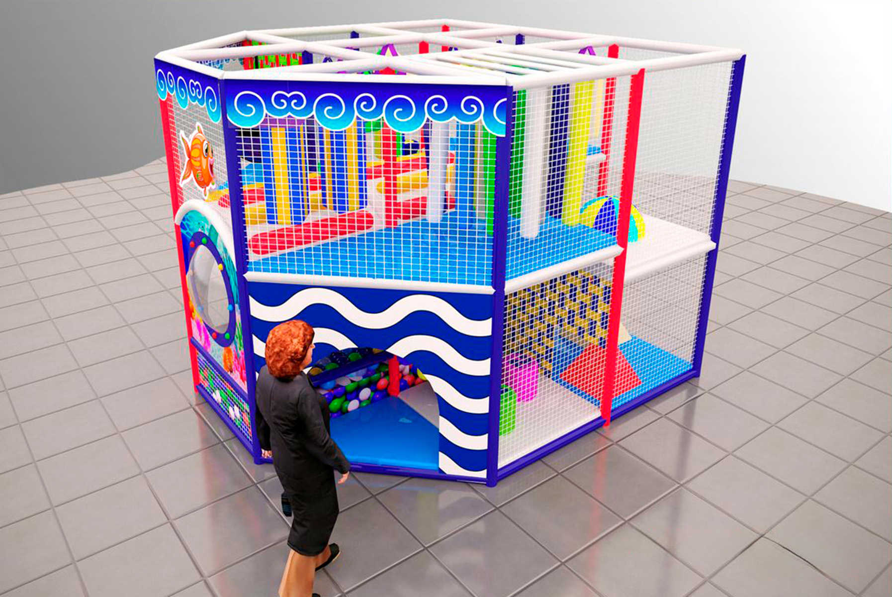 Лабиринт «Рыбкино Царство» имеет компактные размеры – 3.7x3.7x2.8 м, что делает его удобным даже для небольших помещений. Несмотря на компактность, он просторен внутри и позволяет одновременно играть нескольким детям.