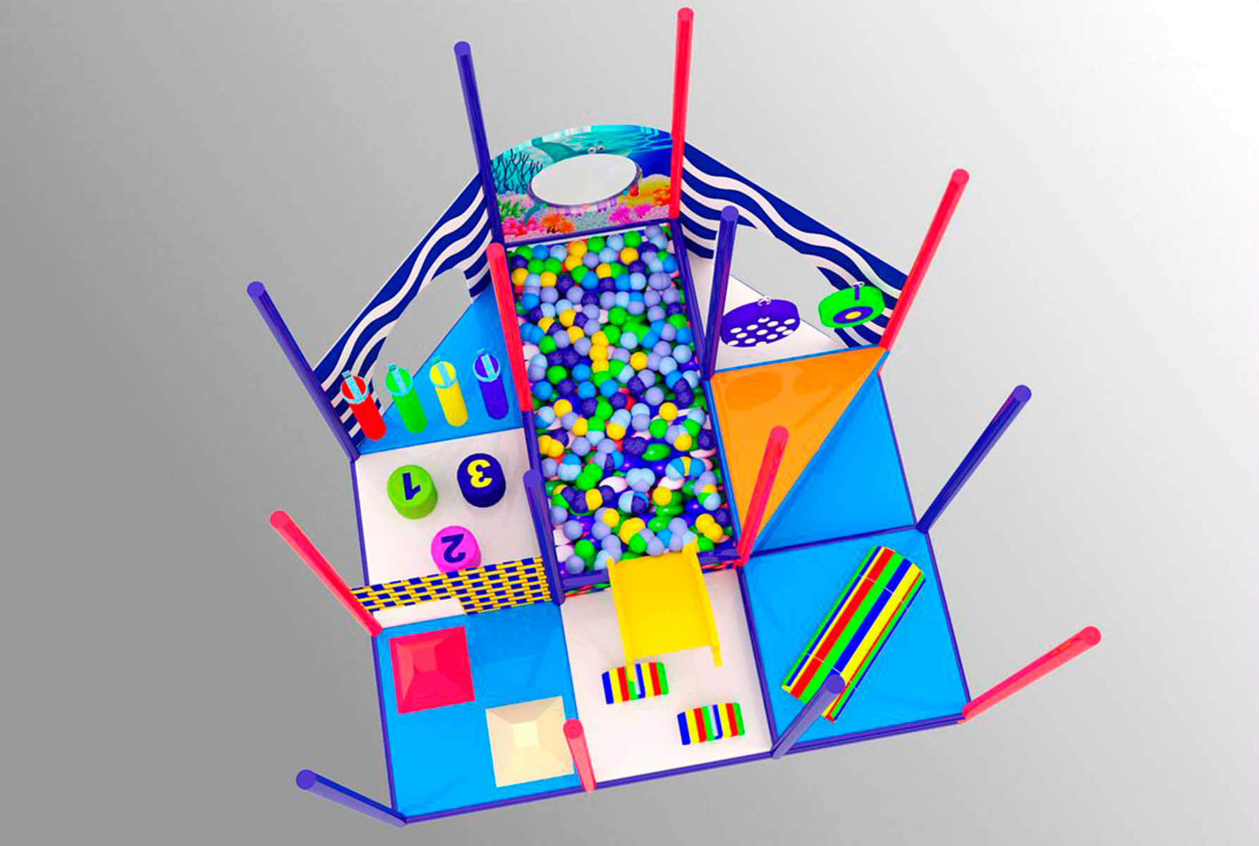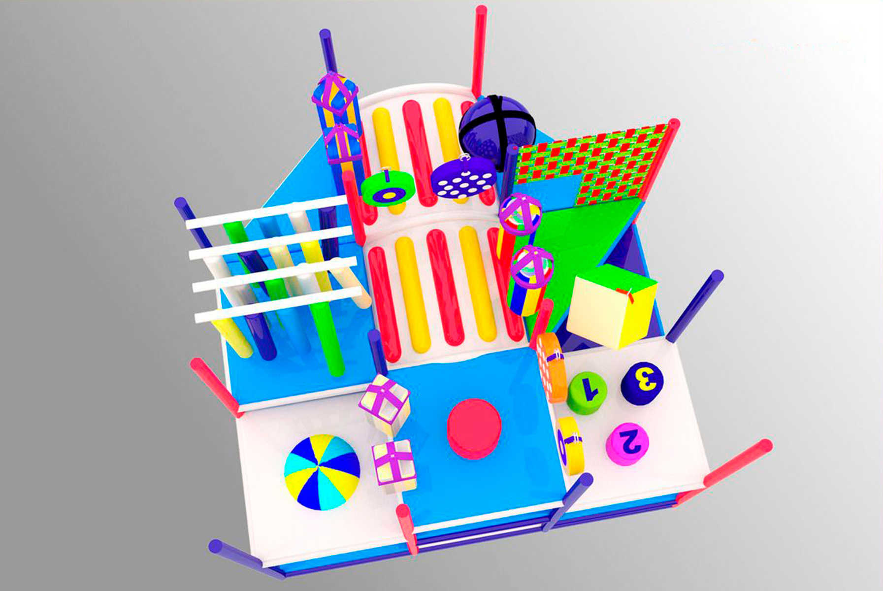 - Двухуровневое пространство – дети могут лазать, прыгать, пробираться через тоннели и платформы, исследуя игровое пространство.